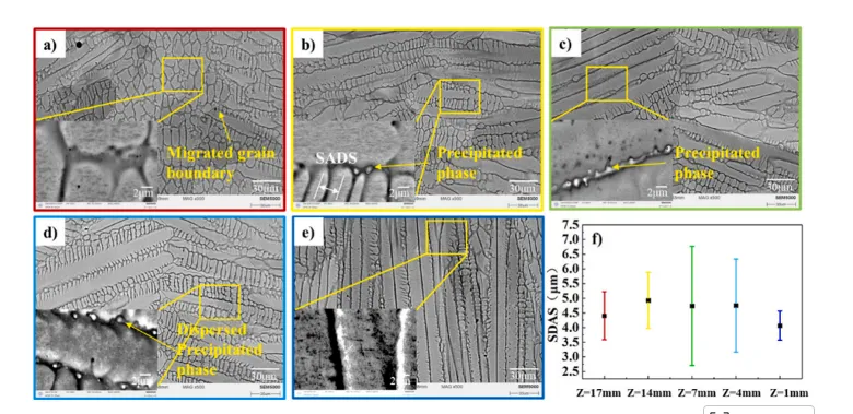 图11.焊缝底部不同深度处焊接接头的显微组织特征。a)Z=17-18mm区域;b)Z=14-15mm区域;c)Z=7-8mm区域;d)Z=4-6mm区域;e)Z=1-2mm区域;f)不同深度处焊接接头的二次枝晶臂间距(SDAS)。