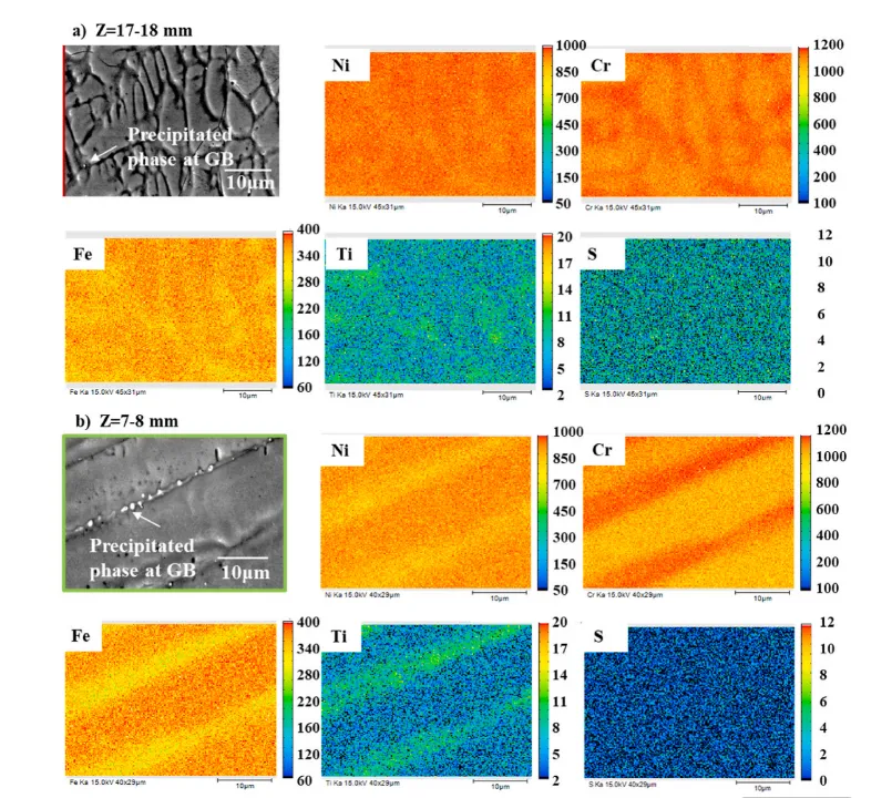 图12. 焊接接头不同深度处的元素分布。a) Z = 17-18 mm区域;b) Z = 7-8 mm区域。