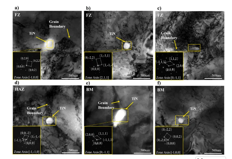 图13. 不同区域焊接接头中析出相的组成与结构。a)-c) 热影响区(FZ)中的析出相;d) 热影响区(HAZ)中的析出相;e)-f) 基体金属(BM)中的析出相。