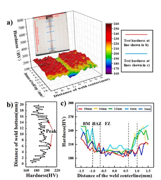 图14. 焊接接头横向与纵向方向上的硬度梯度分布。a) 焊缝截面硬度分布示意图;b) 焊缝组织区(FZ)沿深度方向的硬度分布;c) 不同深度处的焊缝硬度分布。