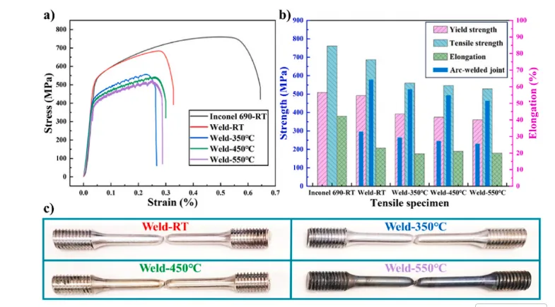 图15. 焊接接头的拉伸性能。a) 焊接接头的拉伸应力-应变曲线;b) 焊接接头屈服强度、抗拉强度及延伸率的统计分析;c) 拉伸试验后的断裂试样。