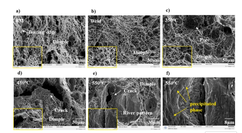 图16. 拉伸断裂特性。a) 骨髓(BM)试样;b) 室温下焊接试样;c) 350°C下焊接试样;d) 450°C下焊接试样;e) 550°C下焊接试样;f) 断裂面中的析出物。
