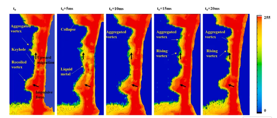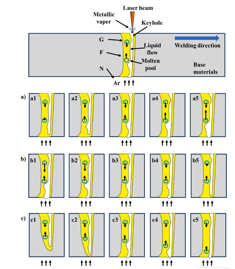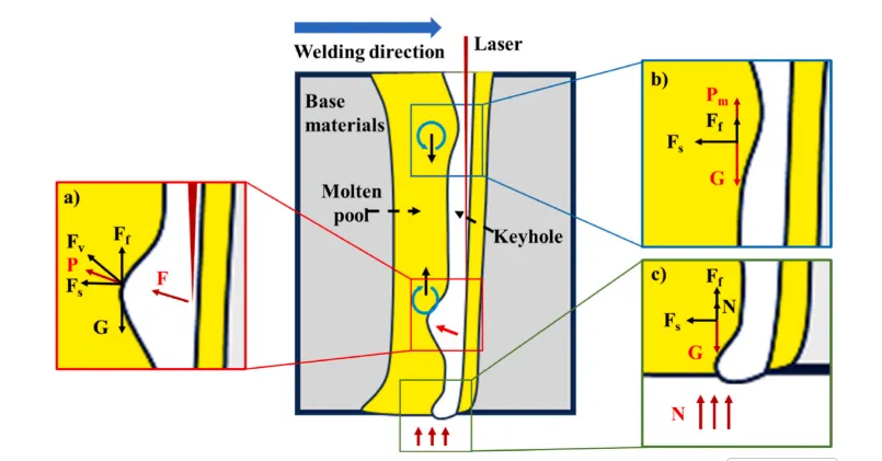 图18. 熔池不同位置处的作用力分布。a) 回弹涡流区;b) 聚集涡流区;c) 焊缝底部。Fs表示金属蒸气与熔池之间的表面张力,Ff表示金属蒸气与熔池间的摩擦力。Fv为激光束传递至键孔后壁的回弹压力。Pm代表熔池压力,F表示激光回弹力,G代表熔融金属重力,N表示氩气保护压力。