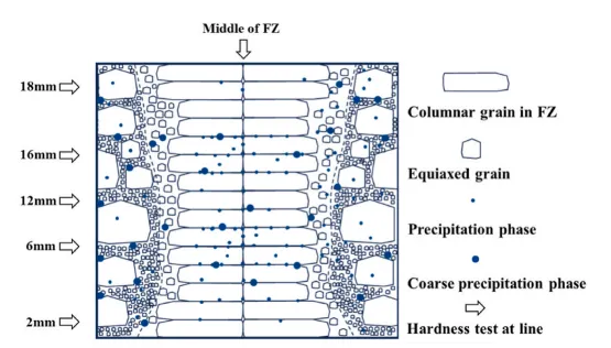 图20. 焊缝中晶粒及沉淀物尺寸与分布示意图。