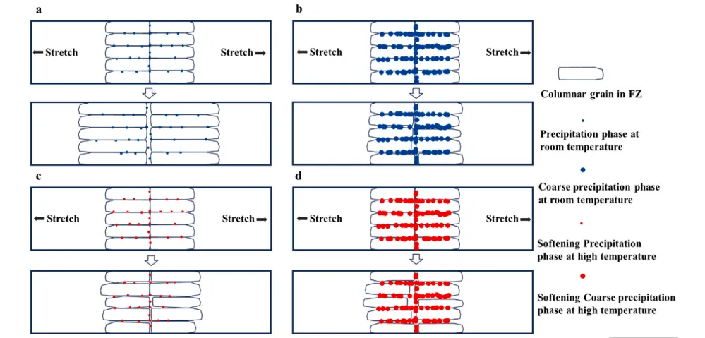 图21. 拉伸断裂机制。a) 细小析出物在室温下的拉伸断裂机制;b) 粗大析出物在室温下的拉伸断裂机制;c) 细小析出物在高温下的拉伸断裂机制;d) 粗大析出物在高温下的拉伸断裂机制。