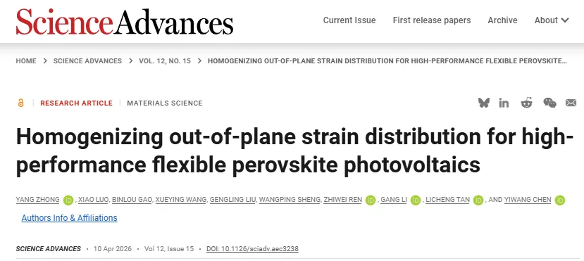 2026年4月10日,南昌大学谈利承、陈义旺团队在《Science Advances》刊发研究成果,针对柔性钙钛矿太阳能电池(PVSCs)长期存在的稳定性与机械耐久性难题取得关键突破,为该技术的商业化应用奠定了重要基础。