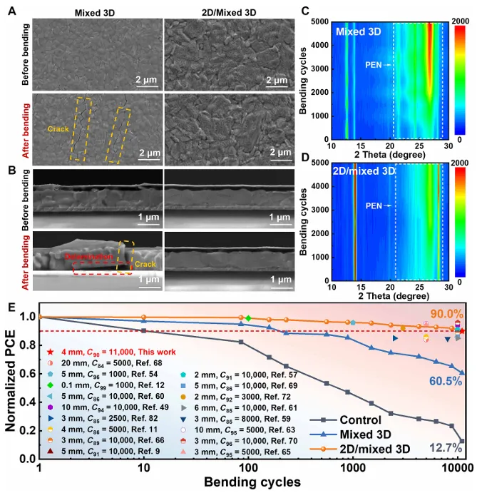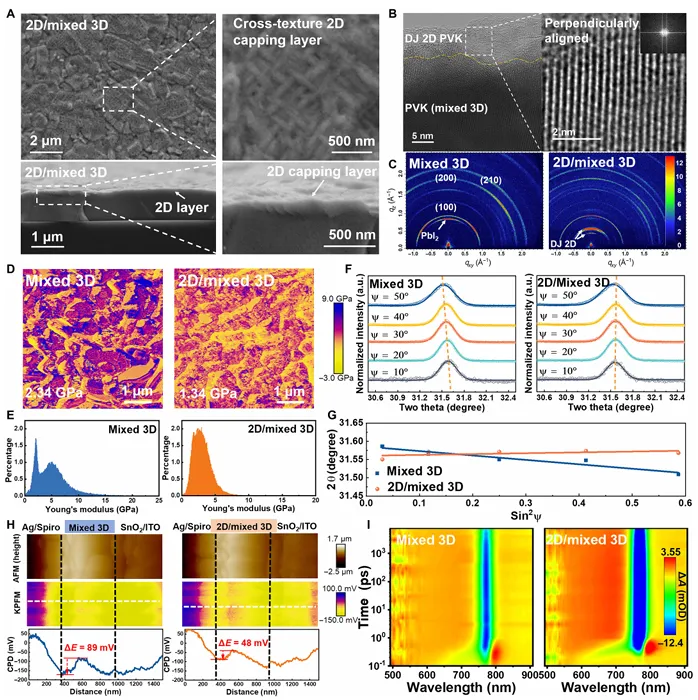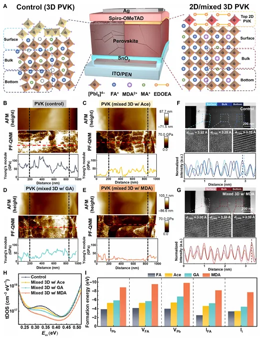 针对上述瓶颈,研究团队采用双重优化策略实现突破:一是通过精准优化A位阳离子掺杂比例,有效降低晶格缺陷密度与微观应变,提升组分均匀性,同时借助先进的面外应变可视化技术,揭示了应变均匀化的关键路径;二是在富PbI₂表面原位形成二维钙钛矿层,该层可有效释放残余应力、促进界面载流子传输,同时显著增强钙钛矿薄膜的机械性能。