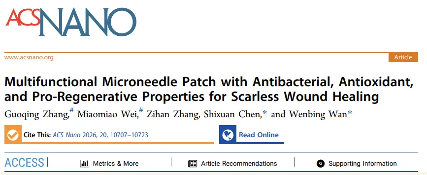 参考文献:Multifunctional Microneedle Patch with Antibacterial, Antioxidant, and Pro-Regenerative Properties for Scarless Wound Healing.Guoqing ZhangMiaomiao WeiZihan ZhangShixuan Chen Wenbing Wan.2026, DOI:10.1021/acsnano.6c01964