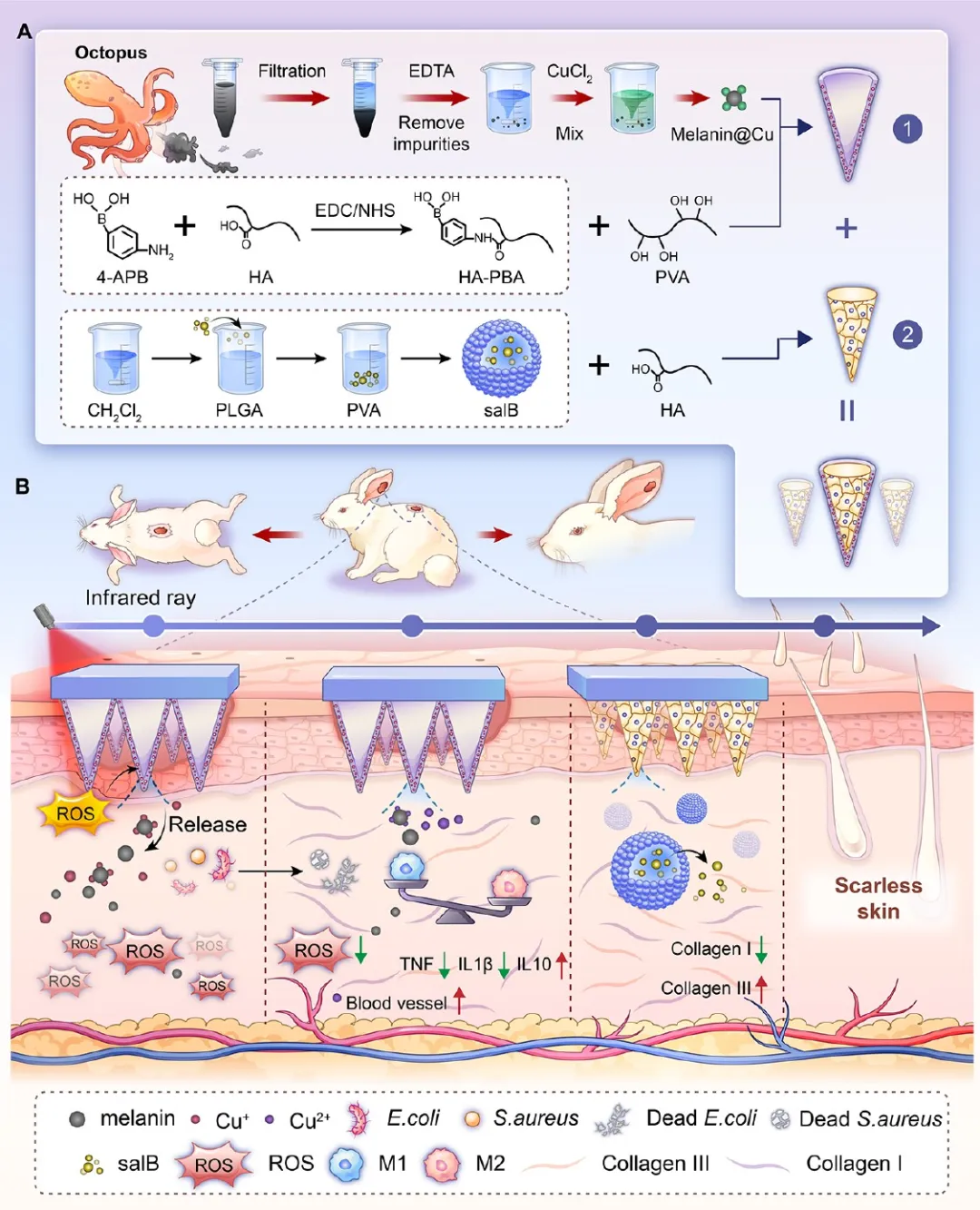 (A)微针系统由含 Melanin@Cu 的壳层和填充 Sal B 微球的核心组成。(B)光热照射下,MN + M@Cu + Sal B 通过 ROS 响应逐步释放 Cu⁺/Cu²⁺,构建抗菌、抗炎微环境并促进营养血管生成,形成动态愈合级联;随时间推移,逐渐暴露的核心促进无瘢痕愈合。