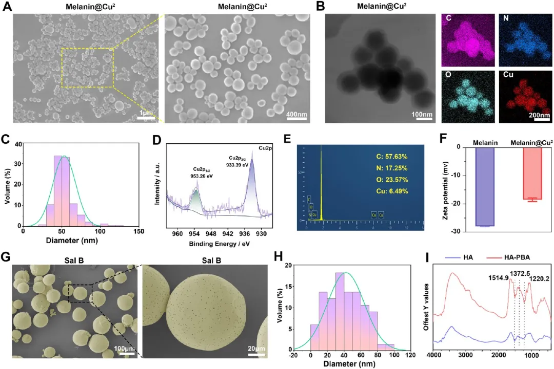 (A)Melanin@Cu 的 SEM 图像(B)Melanin@Cu 的 TEM 图像(标尺:100 μm)及 EDS 元素映射图像(标尺:200 μm)(C)Melanin@Cu 粒径分布(D)XPS 全谱。(E)EDS 能谱与元素定量(F)黑色素与 Melanin@Cu 的 Zeta 电位(G)Sal B 的 SEM 图像(H)Sal B 粒径分布(I)FTIR 光谱