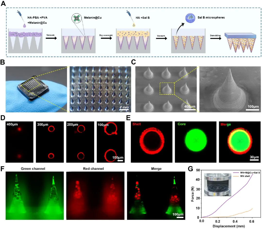 (A)模铸法制备 MN + M@Cu + Sal B 阵列贴片流程示意图。(B)MN + M@Cu + Sal B 实物图。(C)MN + M@Cu + Sal B 侧面 SEM 图及放大图。(D)罗丹明 B 标记的 MN + M@Cu + Sal B 壳层底部共聚焦图像,z 轴间隔 100 μm。(E)核 - 壳结构 MN + M@Cu + Sal B 图像,罗丹明 B 标记壳层(红色)、FITC 标记核心(绿色),标尺:30 μm。(F)MN + M@Cu + Sal B 图像,标尺:100 μm。(G)MN + M@Cu + Sal B 压缩测试照片及微针壳层与完整微针的机械强度。