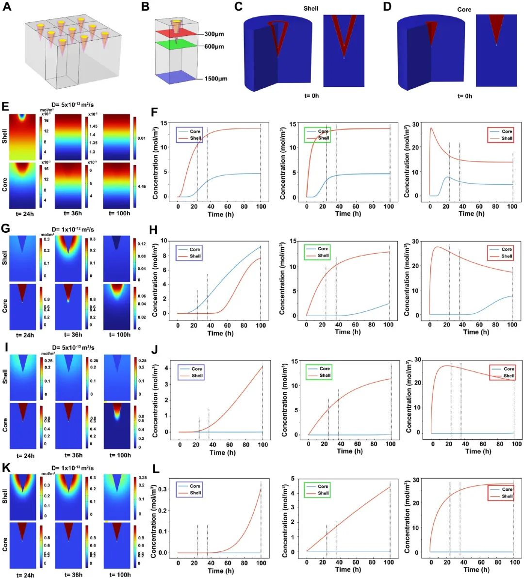 (A)双层微针模型构建。(B)三个平行平面(底部蓝色、中部绿色、顶部红色)用于评估生物膜不同深度的药物浓度。(C–K)扩散初始(t=0)及 24、36、100 h 后,不同扩散系数与平面下双层微针药物浓度色标图(E、G、I、K);对应底部、中部、顶部平面的药物浓度随时间分布(F、H、J、L)。