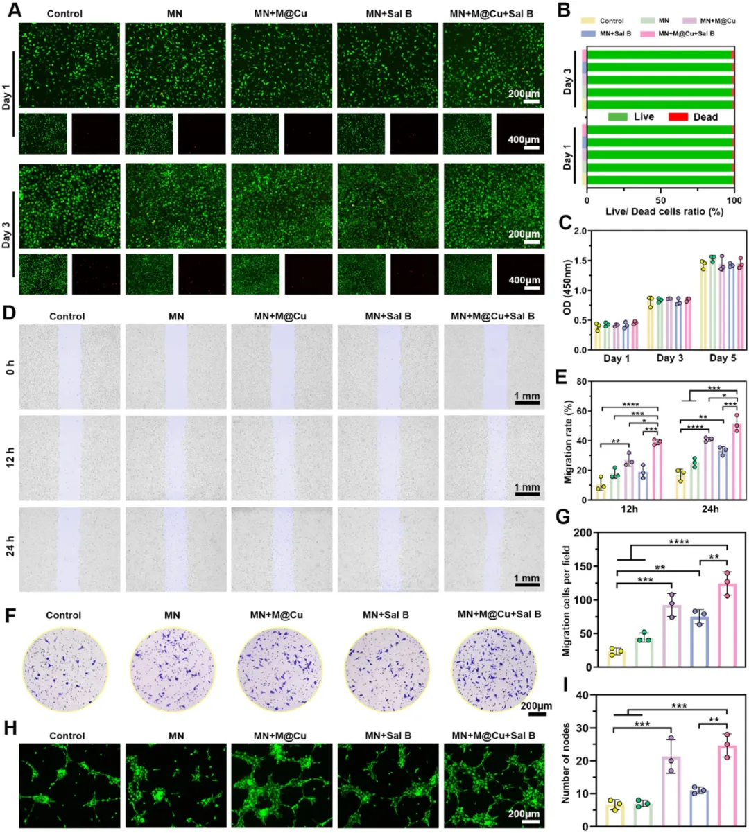 (A)对照组、MN、MN + M@Cu、MN + Sal B、MN + M@Cu + Sal B 浸提液培养 L929 细胞 1 天、3 天的活 / 死染色图。(B)活 / 死细胞比例分析。(C)L929 细胞培养 1、3、5 天的 CCK-8 分析。(D)不同处理组 L929 细胞 0、12、24 h 划痕愈合实验,标尺:1 mm。(E)划痕实验体外迁移率定量(n=3);L929 细胞 Transwell 迁移明场图及定量(n=3),标尺:200 μm。(I)节点数量定量,数据为均值 ± 标准差,**P<0.01,****P<0.0001。