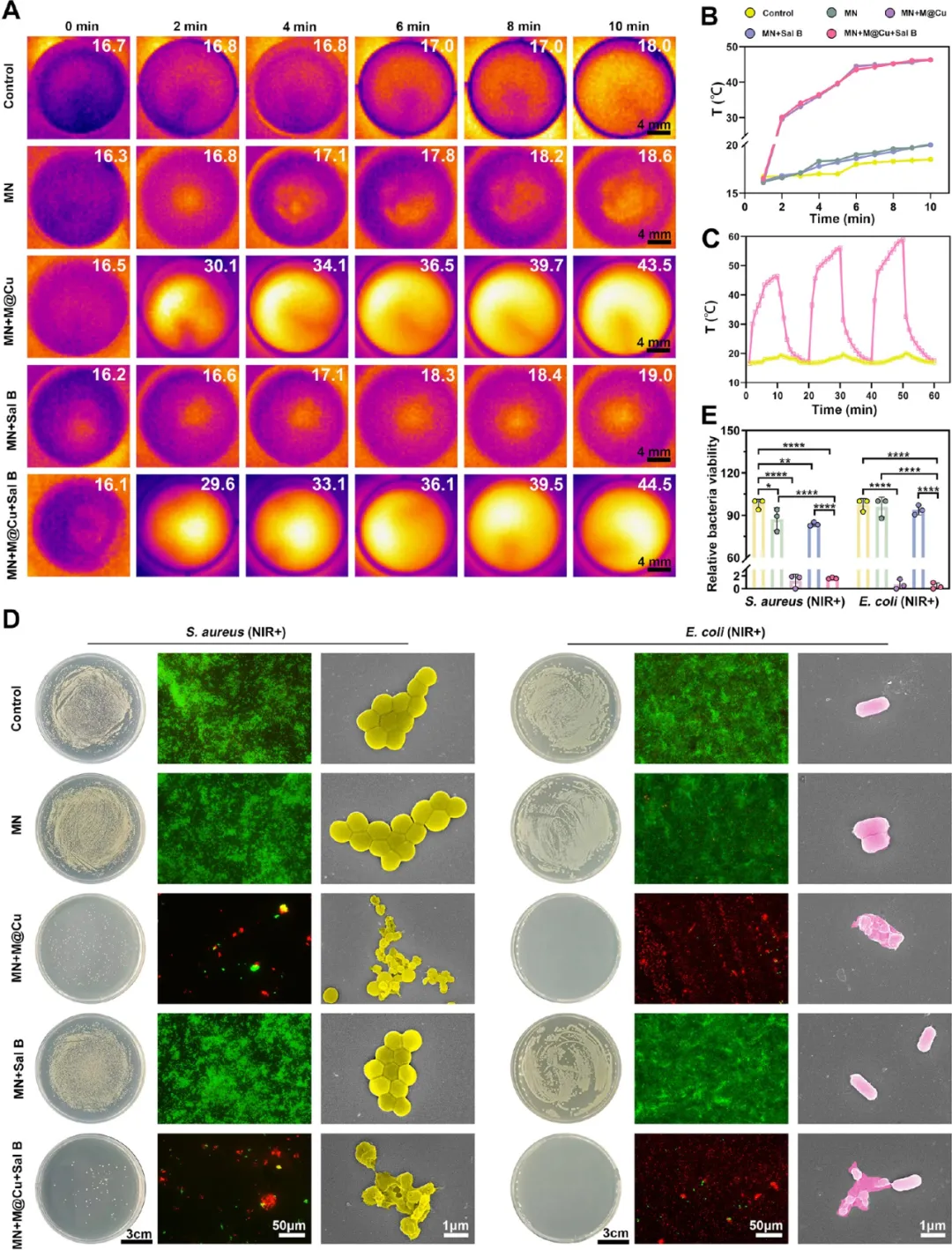 (A)对照组、MN、MN + M@Cu、MN + Sal B、MN + M@Cu + Sal B 近红外照射 0、1、2、3、4、5 min 的红外热成像图。(B)近红外处理后各组温度定量。(C)各组反复近红外照射的温度变化。(D)各组培养的金黄色葡萄球菌、大肠杆菌菌落、活 / 死细菌染色、SEM 图像。(E)近红外处理后各组金黄色葡萄球菌、大肠杆菌活菌率定量(n=3),数据为均值 ± 标准差,*P<0.05,**P<0.01,****P<0.0001。