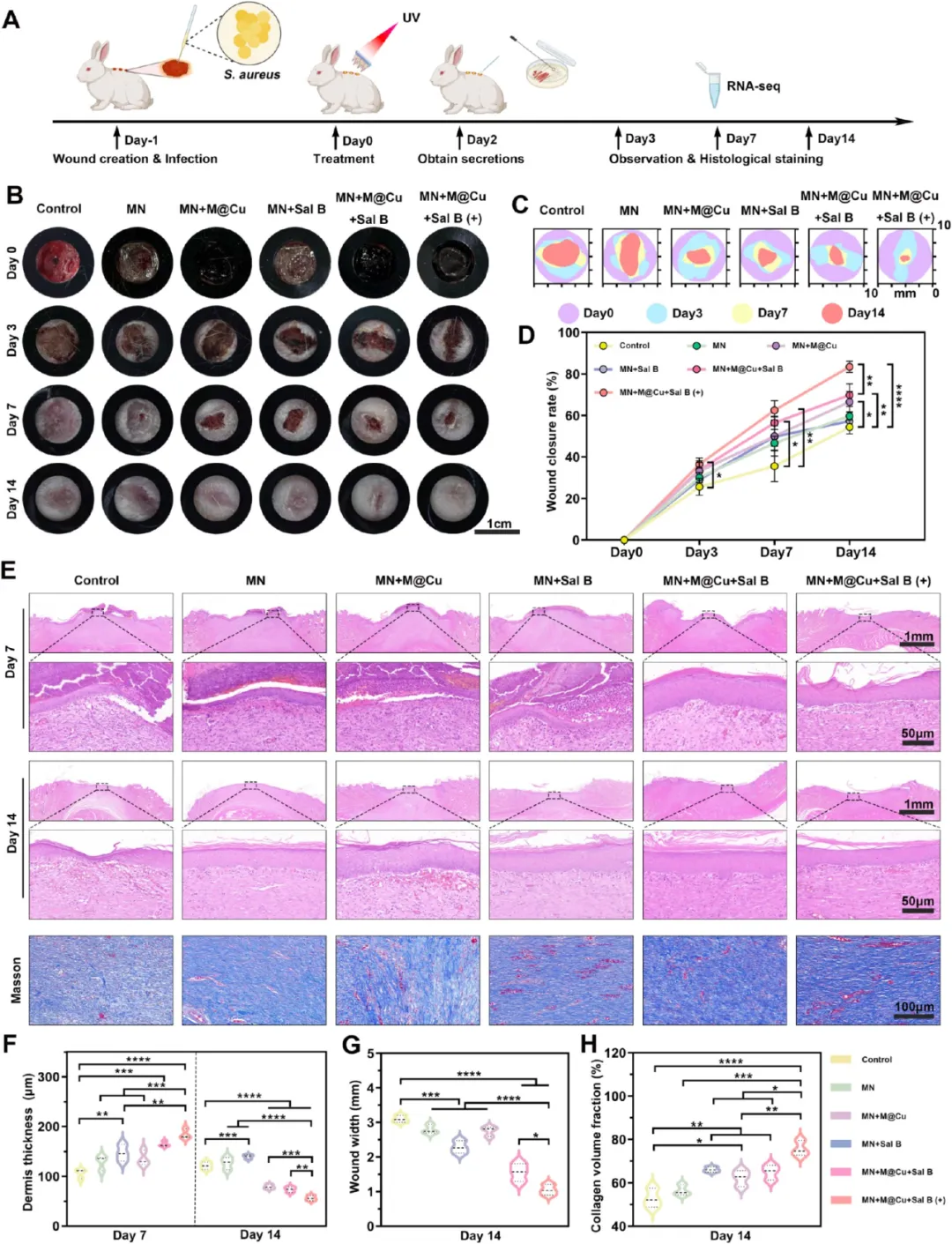 图7: MN + M@Cu + Sal B(+)在兔全层创面模型的体内疗效