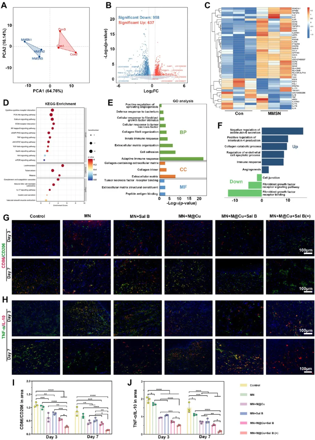 (A)所有样本二维 PCA 图。(B)MN + M@CU + Sal + N+(MMSN)组与对照组火山图,红色为上调基因、蓝色为下调基因。(C)MMSN 组与对照组炎症相关差异基因热图,红色上调、蓝色下调。(D)KEGG 富集分析。(E)差异基因 GO 功能富集分析。(F)GO 功能富集上下调分析。(G–J)第 3、7 天巨噬细胞及相关炎症因子组织免疫荧光与定量图。