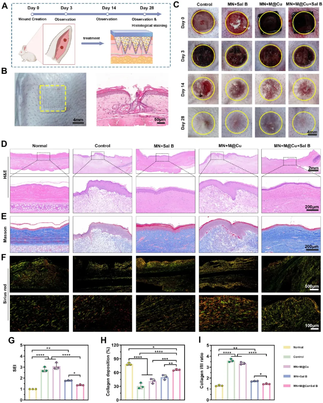 (A)MN + M@Cu + Sal B 促进兔耳无瘢痕愈合实验示意图。(B)微针兔耳穿透测试与 H&E 染色。(C)不同处理组兔耳创面不同时间照片,标尺:4 mm。(D–F)第 28 天创面 H&E(D)、Masson(E)、天狼星红(F)染色图,H&E 上标尺 2 mm、放大标尺 200 μm;Masson 标尺 200 μm;天狼星红上标尺 500 μm、下标尺 100 μm。(G–I)创面瘢痕抬高指数(SEI)、胶原沉积百分比、Ⅰ/Ⅲ 型胶原比例定量(n=3),数据为均值 ± 标准差,*P<0.05,**P<0.01,***P<0.001。