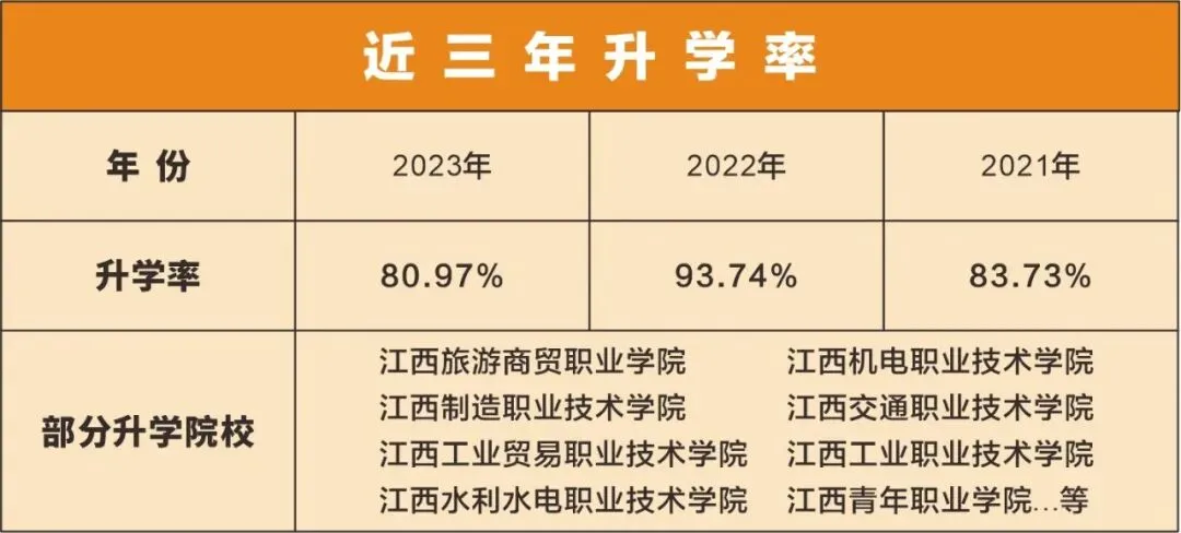 为创新人才培养机制,拓展办学思路,整合办学资源,促进中等和高等职业教育衔接贯通,加快现代职业教育体系建设,提升学生学历,我校与江西旅游商贸学院、江西制造职业技术学院、江西机电职业技术学院等多所高校开展中高职对接合作,通过高职单独招生、高考、“3+2”中高职一体化长学制培养等多渠道升学,圆学子大学梦!