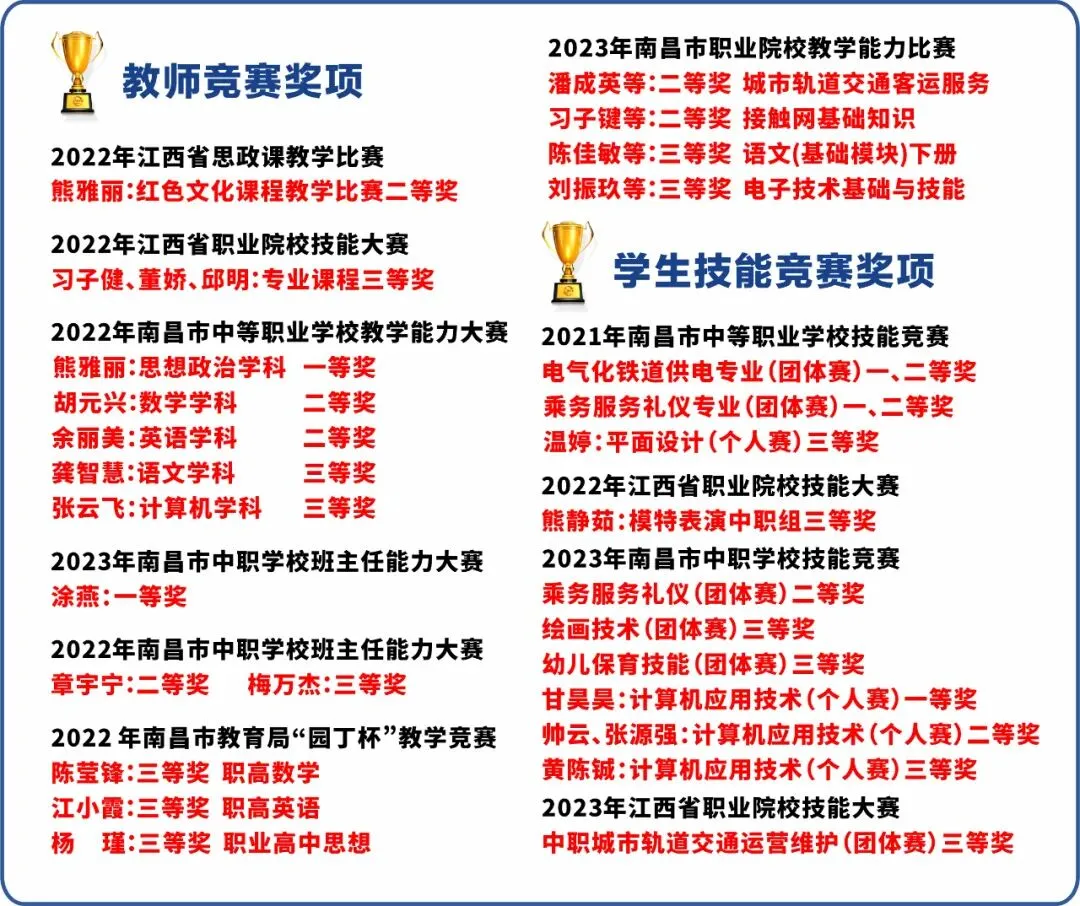 近年来学校深化教育教学改革,深入推进教师队伍建设,创新德育工作形式,积极组织师生参加省、市各类比赛,取得了诸多成绩。肖志平校长被南昌市教育局评为“优秀校长”,他主编的《铁道概论》教材入选教育部首批“十四五”职业教育国家规划教材。 学校校园环境优美、设备设施先进,学校现有茶艺、礼仪、街舞、模特、国旗护卫队等近二十多个协会组织和高铁舱、航空舱、地铁站务环控实训室、牵引供电实训室、机车模拟驾驶操作室等十几个高标准专业实训室,并与铁路单位建立了多个校外实习实训基地,为学生提供有力的实训机会和就业保障。