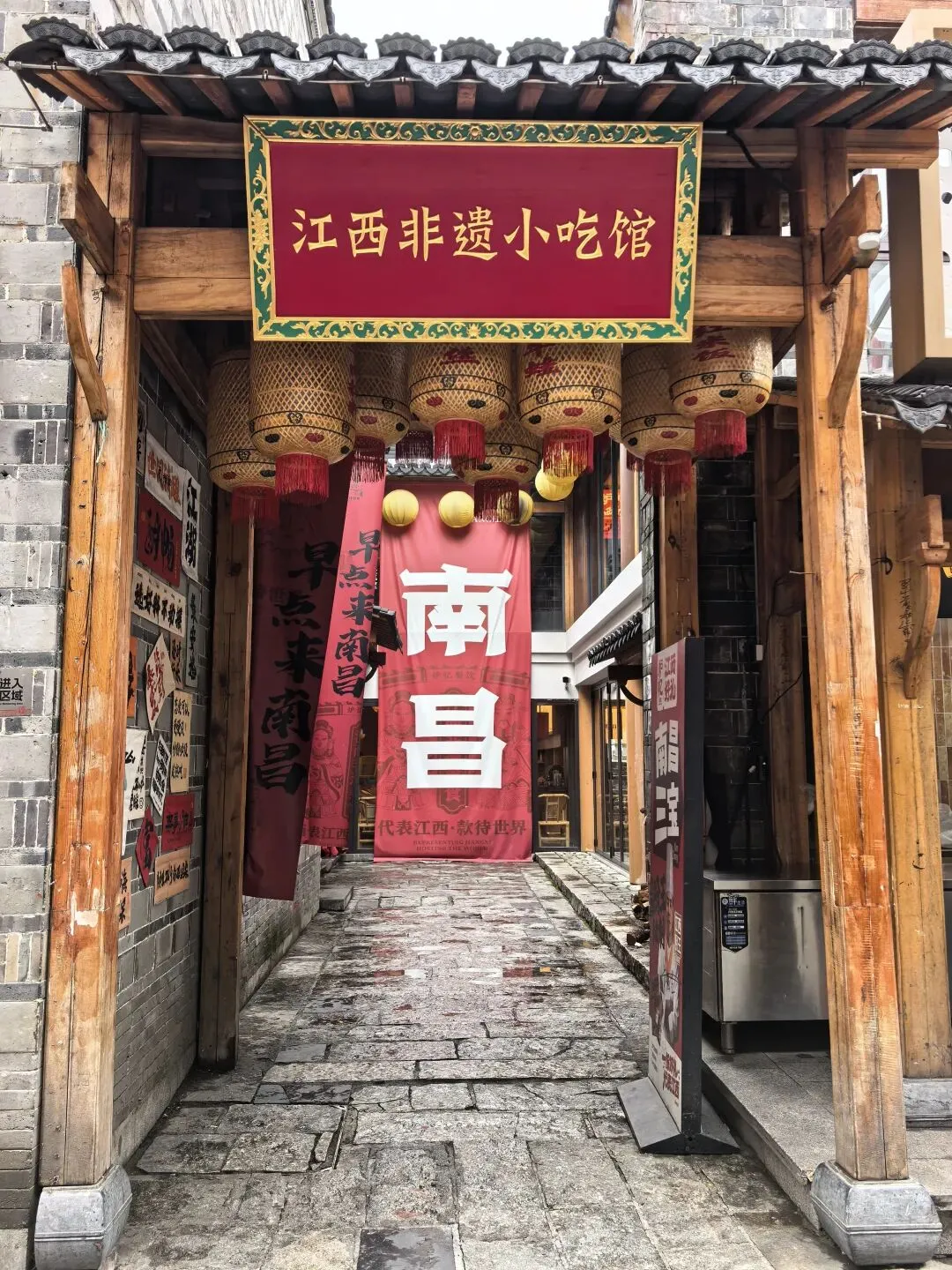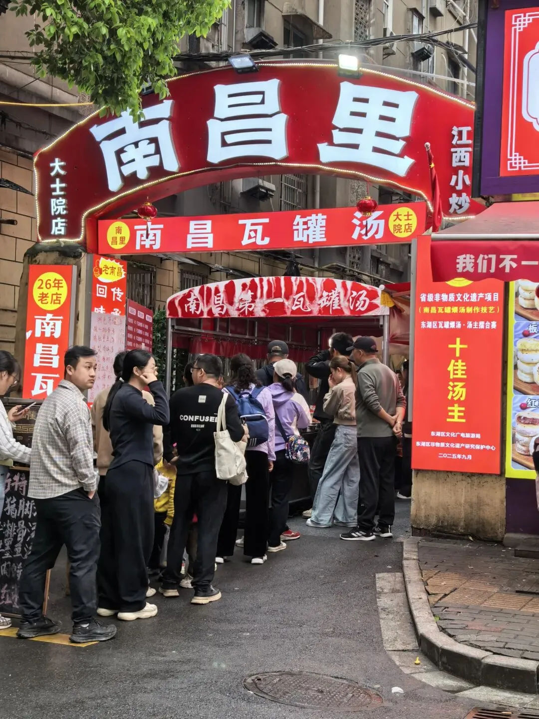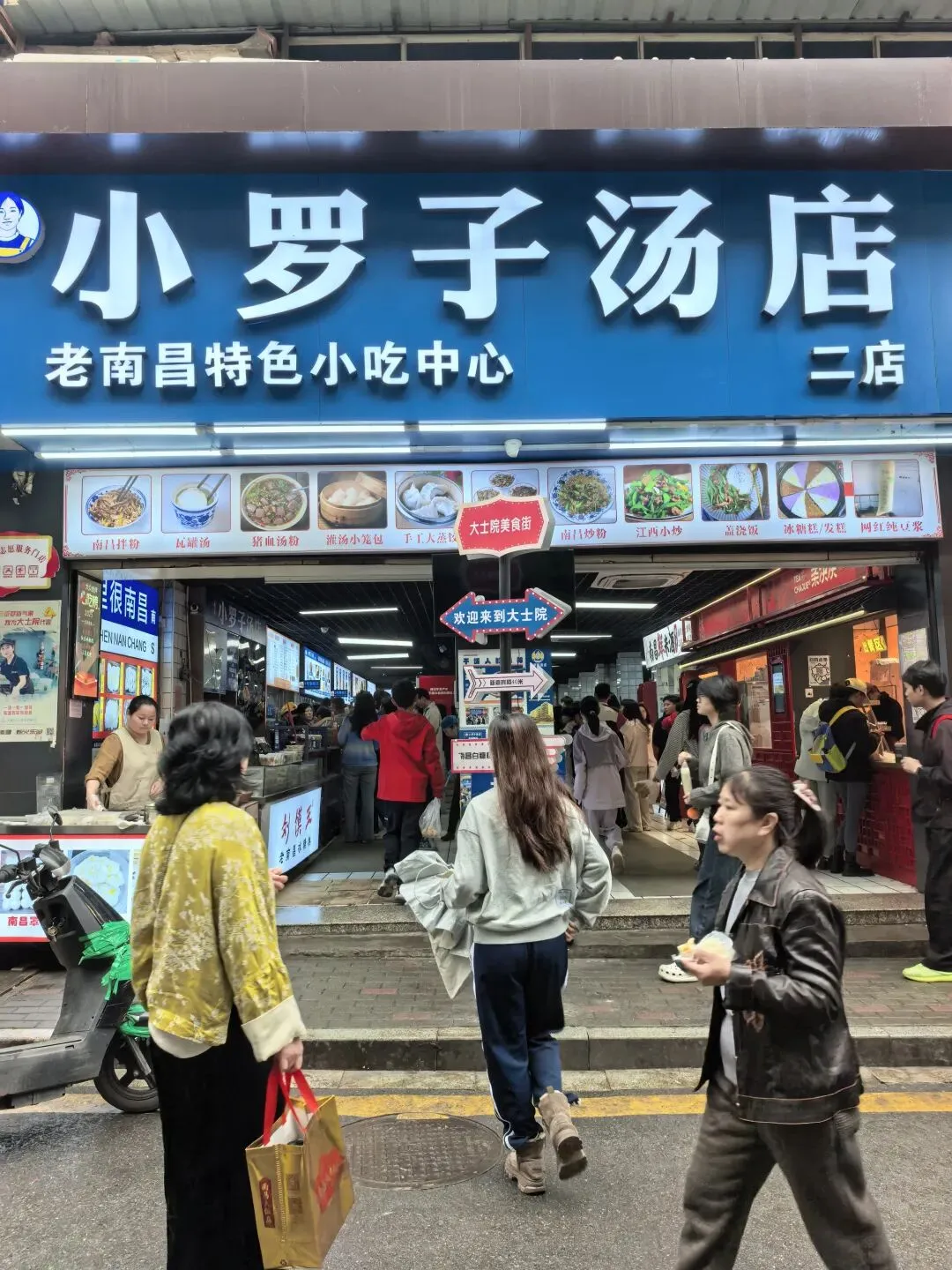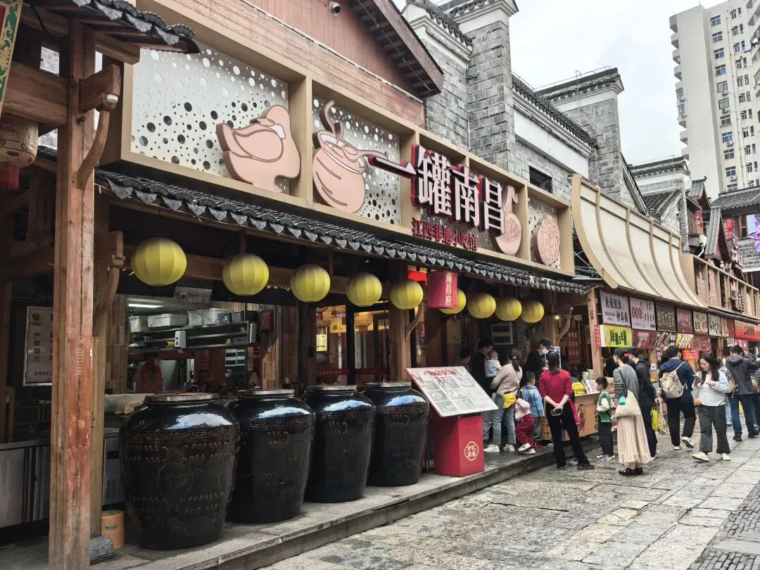 一汤一粉一座城是小罗汤店的广告词,就印在碗里面,广告成本不高效果好。皮蛋肉饼汤第一次喝,味道比较特别。吃饱了,回到主街,发现巷子里有一个环境不错的老南昌特色小吃中N小罗子汤店二店。这里的食客也不少。 从大士院本来打算乘公车去万寿宫,当地的大哥大姐听到我跟小宁说:我们乘公交车去万寿宫。她说:去万寿宫不必坐车,坐公交车要绕很远,浪费时间,从前面小巷右转到是胜利步行街直走,从后面小巷左转直走,都很快就到了。在他俩的热心指引下,我们穿过胜利步街就到达万寿宫。 南昌万寿宫(又称铁柱万寿宫),位于西湖区中山路与船山路交汇处的万寿宫历史文化街区,是全球万寿宫的祖庭、道教净明派圣地,也是南昌核心文旅地标 。 始建于晋代,为纪念治水的许逊(许真君)所立;因许逊铸铁柱镇蛟龙的传说,得名铁柱宫。锁蛟井是历史遗址,现存铁链是现代修复的装饰件,早已不是晋代原物。 讲解员说:2024年3月31日.网传断2根铁链,紧接着南昌出现6小时4.4万次闪电、狂风拔树的极端强对流天气。也许只是巧合晚上这里有鲲茶表演,要不是昨晚下雨,我们也能一包眼富,不过我们平时也不喝茶,也只是看看美女,看看热闹罢了。 茶决决是南昌本土新中式茶饮顶流,主打江西本土茶+国风颜值+现泡纯茶,被称为“南昌版茶颜悦色”。2021年,总部在南昌万寿宫。为了帮小宁集齐一套 青花瓷系列(景德镇青花瓷杯套+mini茶壶,可带走)我们点了五杯茶决决。南昌大饭店(万寿宫店)是万寿宫景区里主打文化+赣菜的热门餐厅,逛古街必打卡之一。
