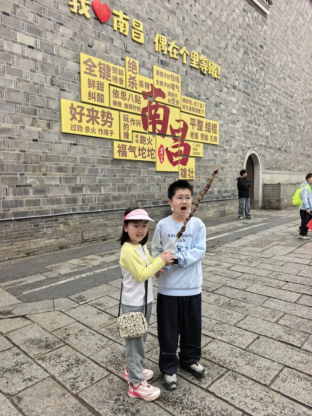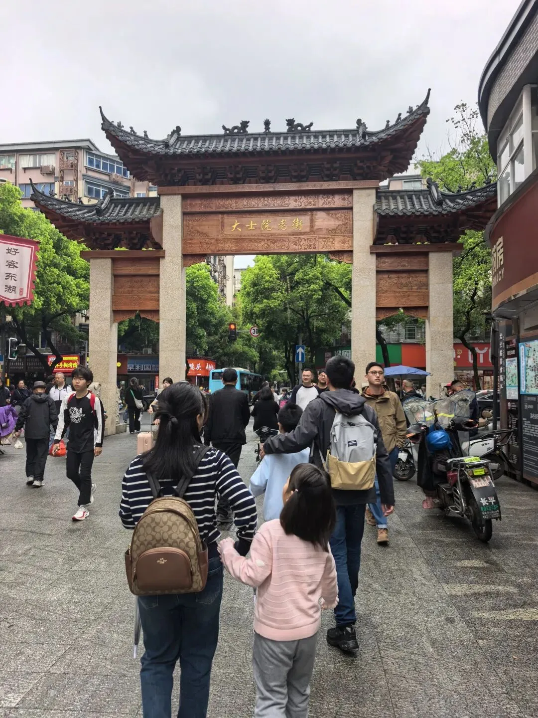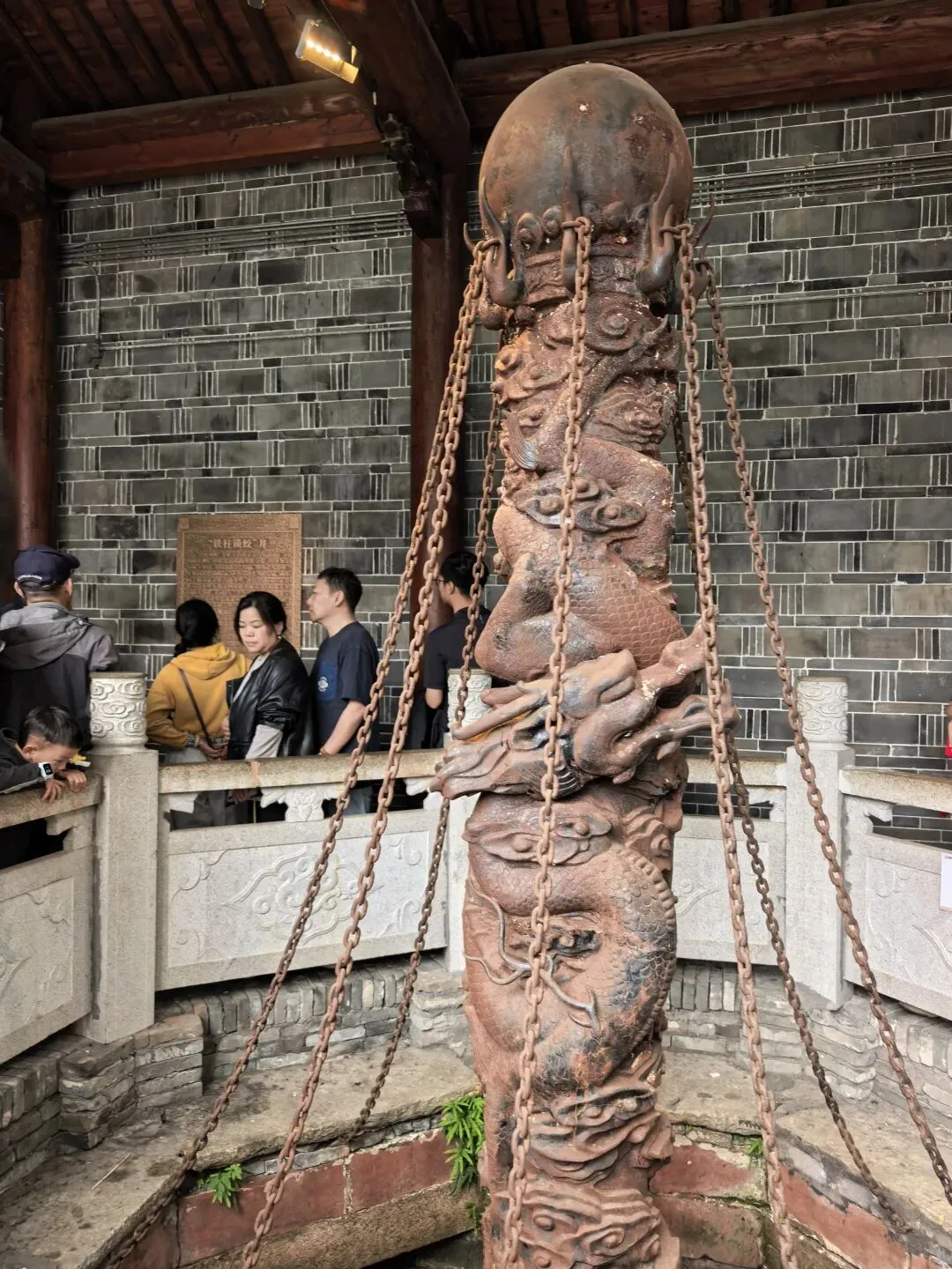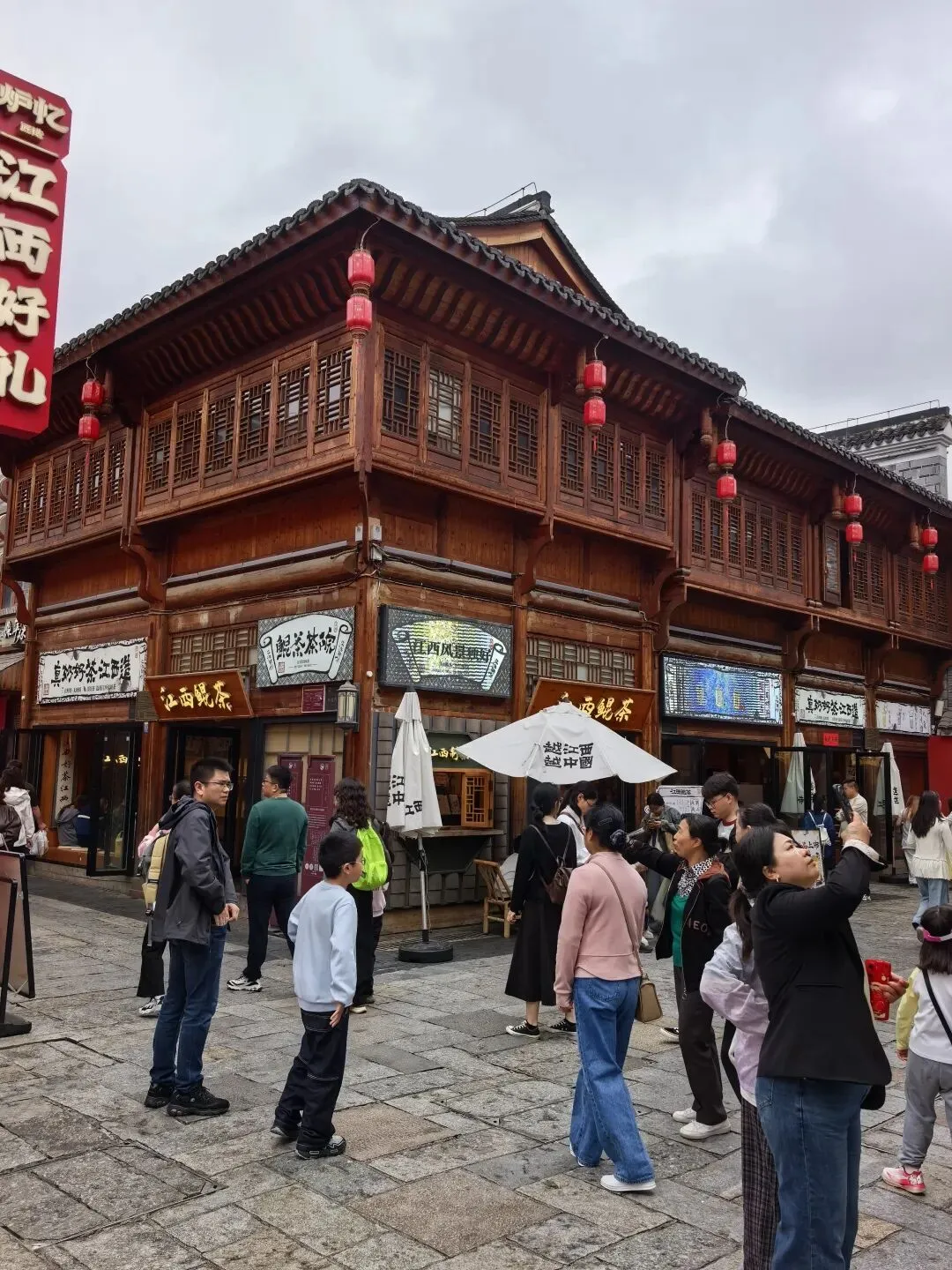 一汤一粉一座城是小罗汤店的广告词,就印在碗里面,广告成本不高效果好。皮蛋肉饼汤第一次喝,味道比较特别。吃饱了,回到主街,发现巷子里有一个环境不错的老南昌特色小吃中N小罗子汤店二店。这里的食客也不少。 从大士院本来打算乘公车去万寿宫,当地的大哥大姐听到我跟小宁说:我们乘公交车去万寿宫。她说:去万寿宫不必坐车,坐公交车要绕很远,浪费时间,从前面小巷右转到是胜利步行街直走,从后面小巷左转直走,都很快就到了。在他俩的热心指引下,我们穿过胜利步街就到达万寿宫。 南昌万寿宫(又称铁柱万寿宫),位于西湖区中山路与船山路交汇处的万寿宫历史文化街区,是全球万寿宫的祖庭、道教净明派圣地,也是南昌核心文旅地标 。 始建于晋代,为纪念治水的许逊(许真君)所立;因许逊铸铁柱镇蛟龙的传说,得名铁柱宫。锁蛟井是历史遗址,现存铁链是现代修复的装饰件,早已不是晋代原物。 讲解员说:2024年3月31日.网传断2根铁链,紧接着南昌出现6小时4.4万次闪电、狂风拔树的极端强对流天气。也许只是巧合晚上这里有鲲茶表演,要不是昨晚下雨,我们也能一包眼富,不过我们平时也不喝茶,也只是看看美女,看看热闹罢了。 茶决决是南昌本土新中式茶饮顶流,主打江西本土茶+国风颜值+现泡纯茶,被称为“南昌版茶颜悦色”。2021年,总部在南昌万寿宫。为了帮小宁集齐一套 青花瓷系列(景德镇青花瓷杯套+mini茶壶,可带走)我们点了五杯茶决决。南昌大饭店(万寿宫店)是万寿宫景区里主打文化+赣菜的热门餐厅,逛古街必打卡之一。