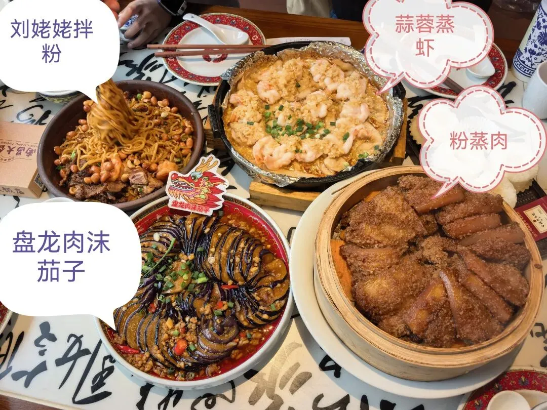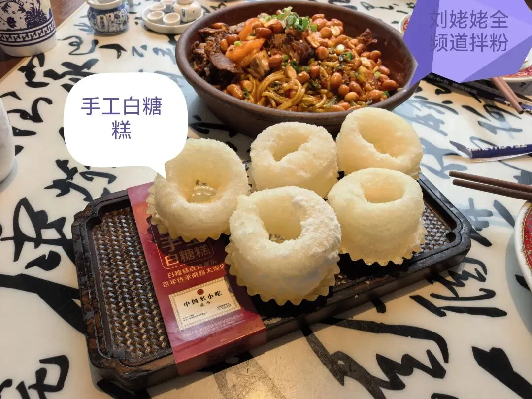 刘姥姥全频道拌粉:配料足,南昌风味地道 拌粉的时候也拌也唱,听了半天也没听清楚唱的啥🤭🤭刘姥姥全频道拌粉和手工白糖糕有特色是根据小红书推荐而点,午餐的菜有多,粉蒸肉和盘龙茄子几符没动,结账走人时,经理过来问:“看您菜都没怎么动,是不好吃吗?请留下宝贵意见,方便我们改进。”是我们点多了,当然盘龙茄子太油,粉蒸肉太肥也是事实。古风舞蹈演艺,我放下筷子录视频,那美人儿舞了一整段,后来发现每一排舞几个动作又换地方。穿古装的打更人报时:南昌大饭店为您报时,天干物燥,小心火烛,现在是南昌时间12点整,当当!