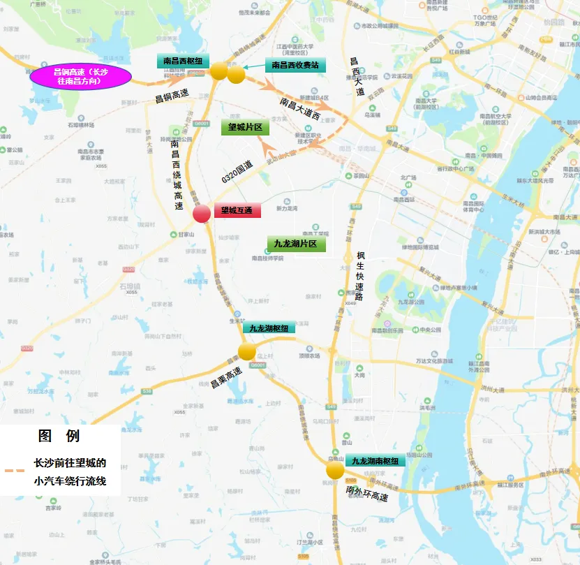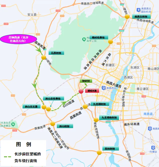4.长沙往南昌方向:昌铜高速→石鼻枢纽→南昌西二绕城高速→西山北互通→西山北收费站→G320国道→望城片区