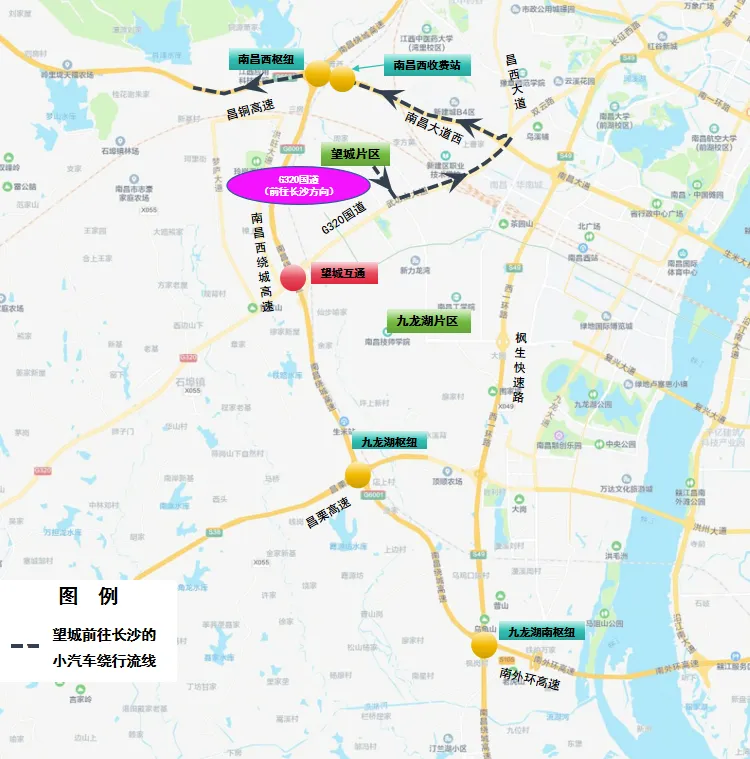 5.高安往南昌方向:昌栗高速→西山枢纽→西山北互通→西山北收费站→G320国道→望城片区