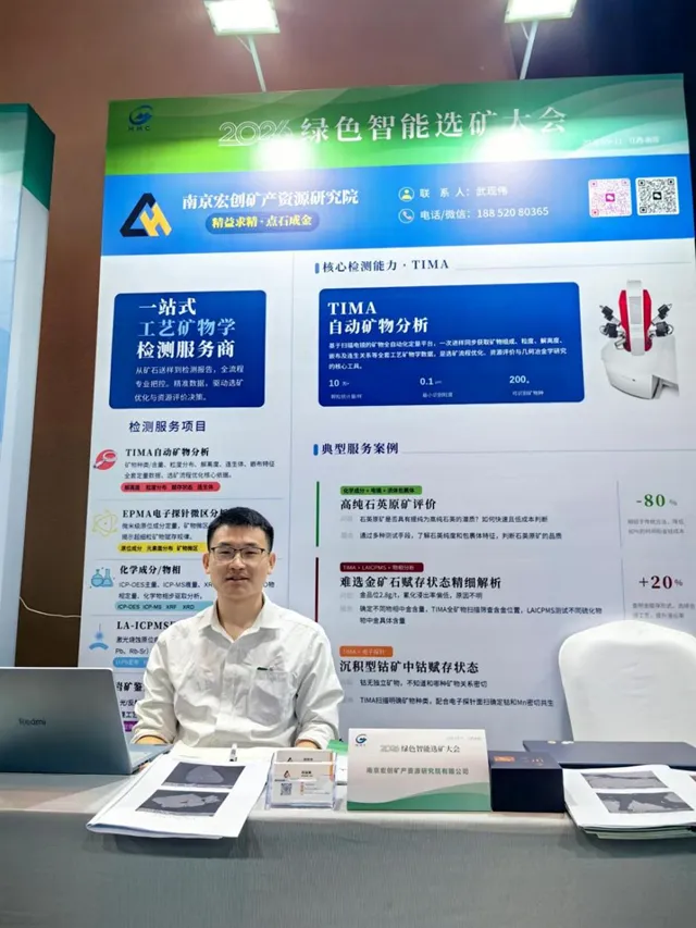 南京宏创矿产资源研究院有限公司盛装参展,并且总经理武现伟在会上作了《工艺矿物学在新兴战略矿产中的应用——以高纯石英与三稀矿产为例》主题报告,系统分享工艺矿物学在战略矿产开发、选矿瓶颈突破、尾矿资源化中的核心价值与工程实践,获得现场高度关注与广泛认可。