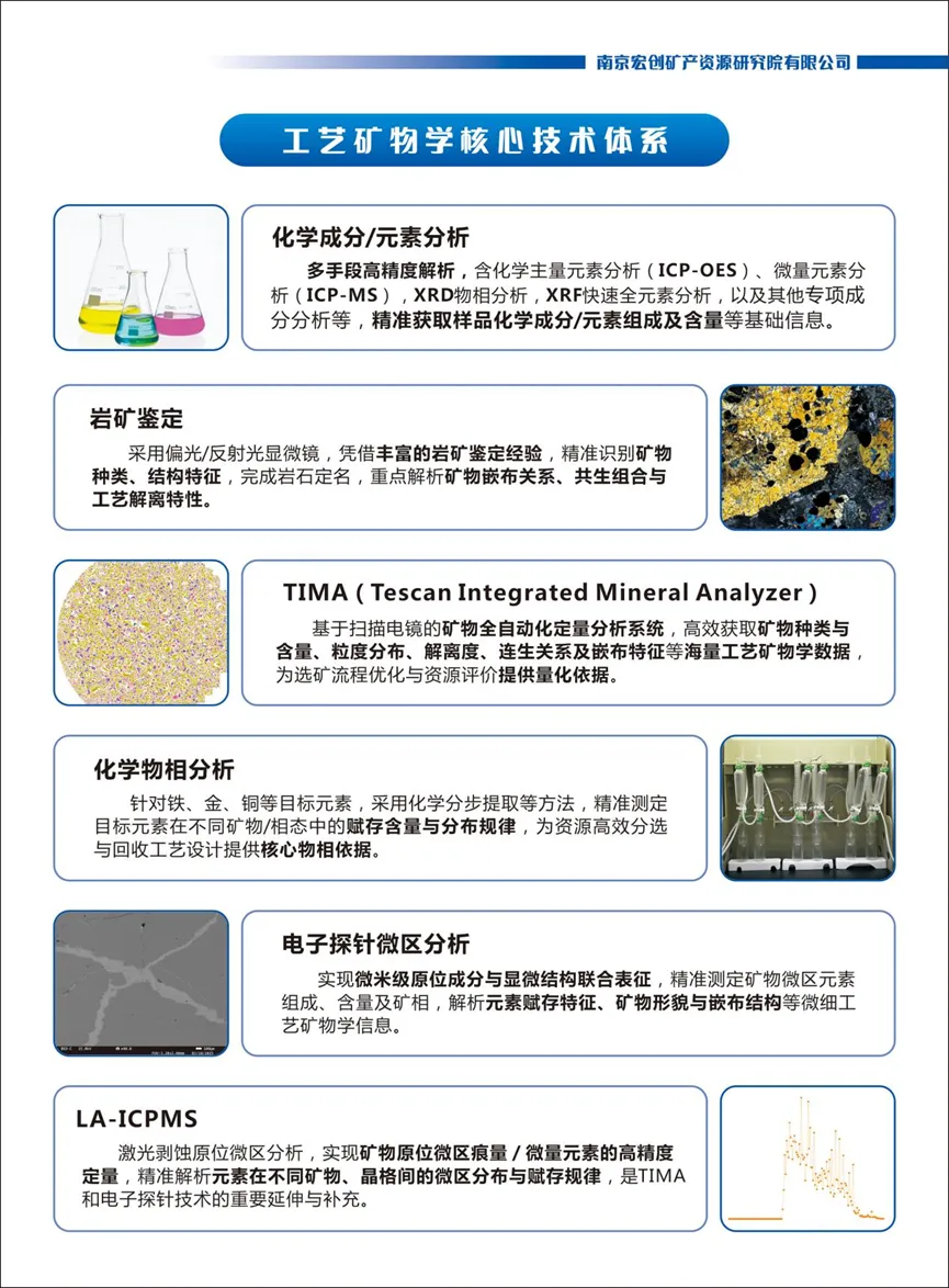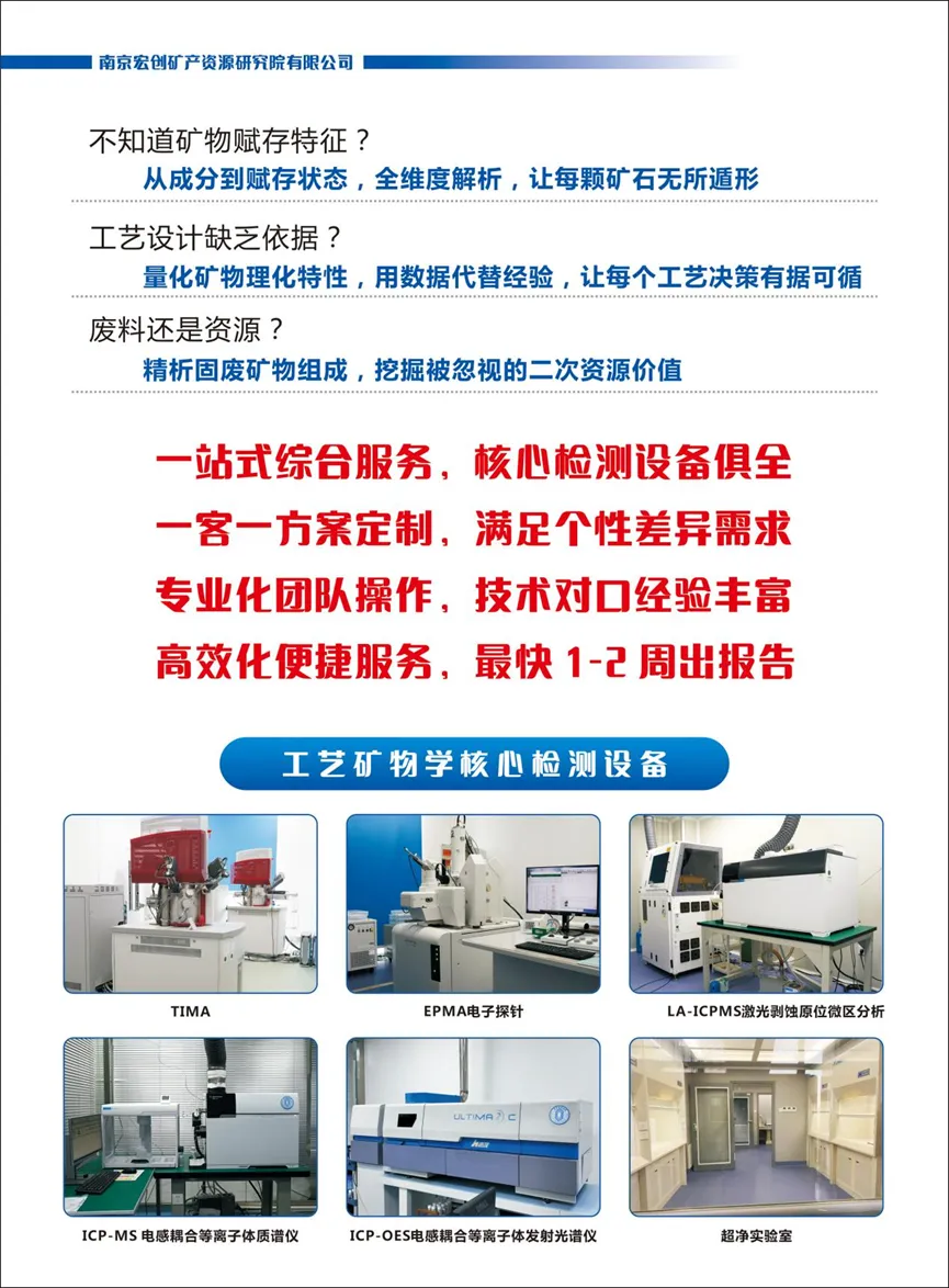 南京宏创矿产资源研究院配备TIMA自动矿物分析系统、EPMA电子探针、LA‑ICPMS激光剥蚀原位微区分析、ICP‑MS/OES电感耦合等离子体质谱仪/发射光谱仪等高端仪器,拥有从样品前处理、微区分析到全岩地化的一站式测试服务体系。无论是哪一个阶段,都能给出最优方案。