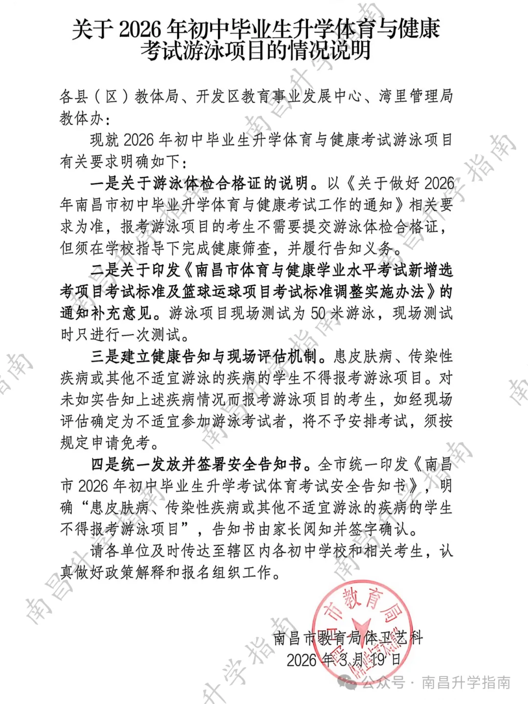 一是关于游泳体检合格证的说明。以《关于做好2026年南昌市初中毕业升学体育与健康考试工作的通知》相关要求为准,报考游泳项目的考生不需要提交游泳体检合格证,但须在学校指导下完成健康筛查,并履行告知义务。