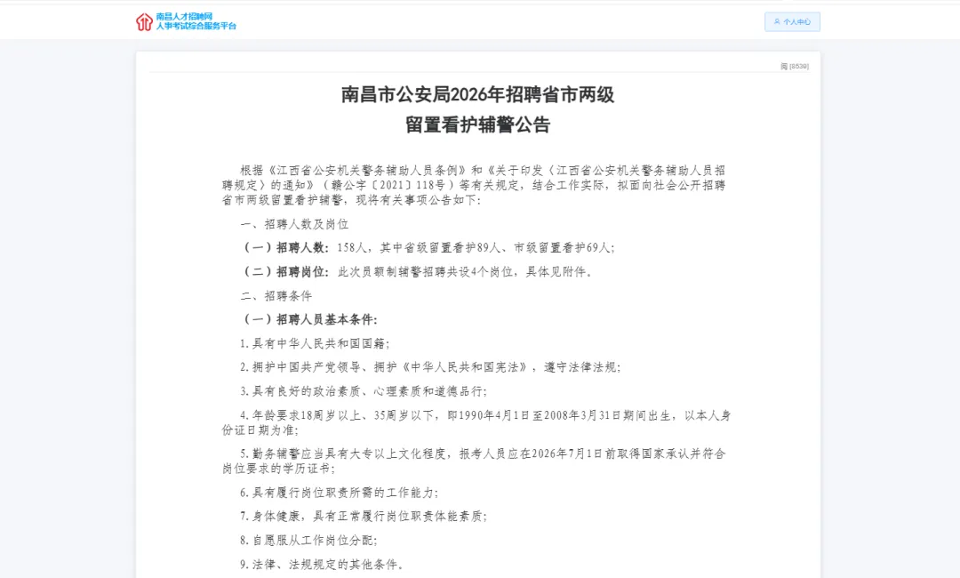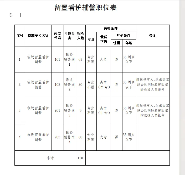 (一)招聘人数:158人,其中省级留置看护89人、市级留置看护69人;