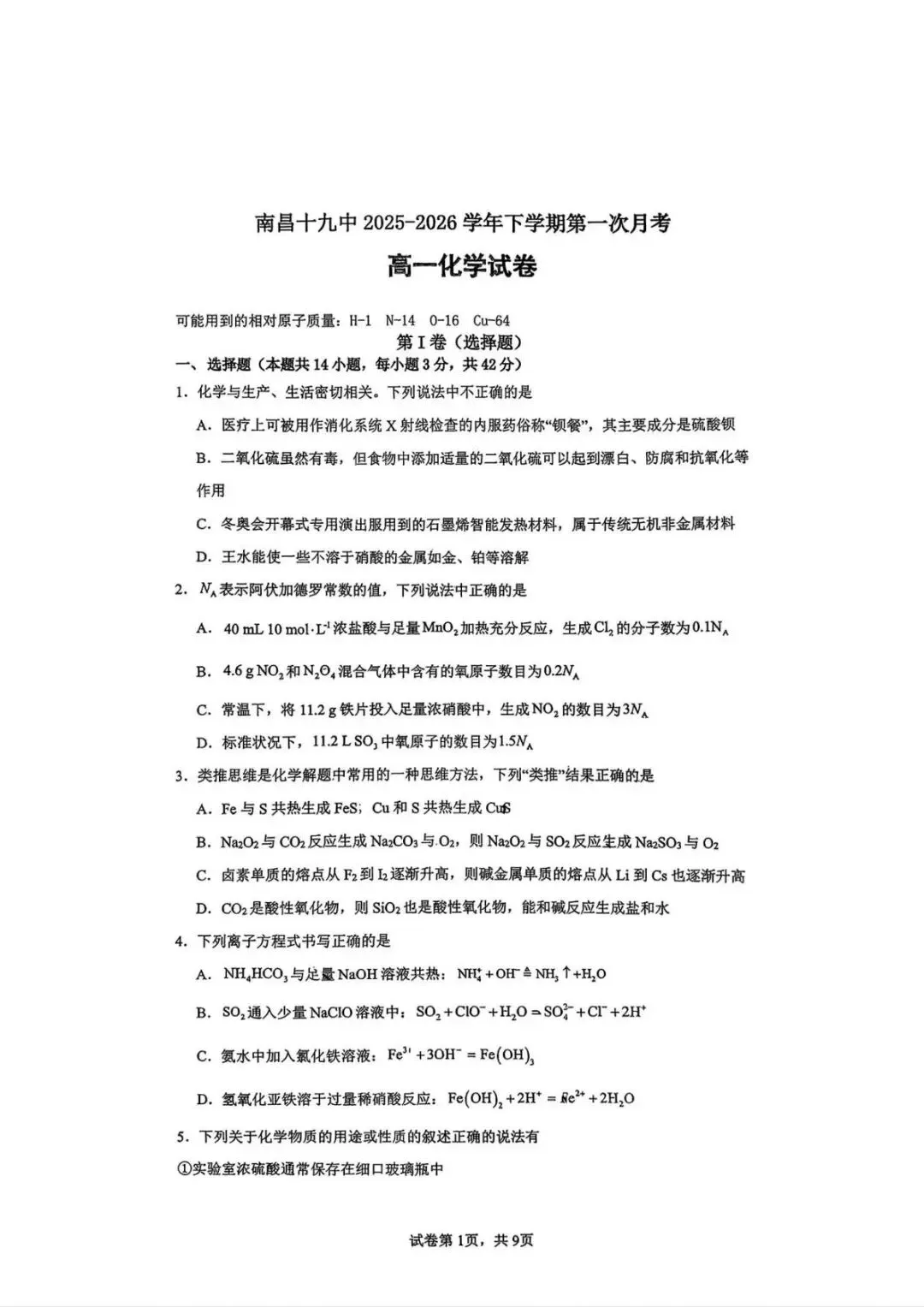 >江西省南昌市南昌第十九中学2025-2026学年高一下学期第一次月考化学试卷.pdf