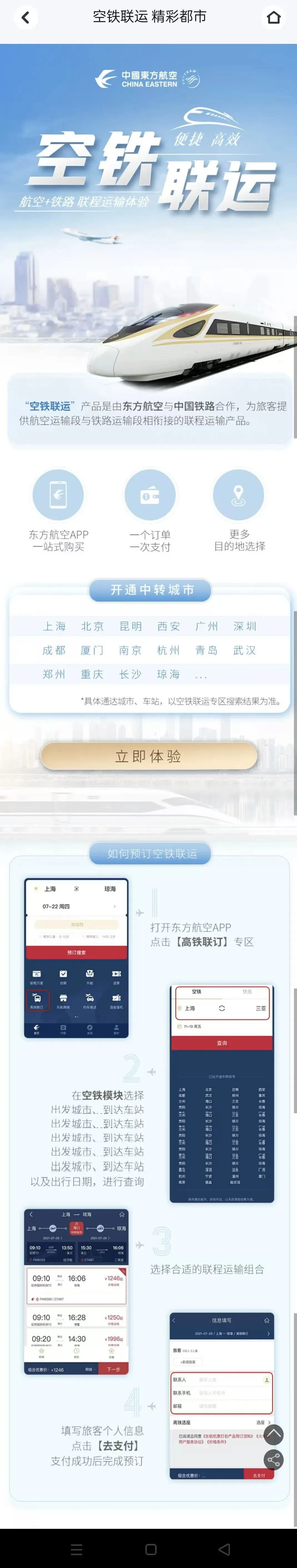 “空铁联运”产品是由东方航空与中国铁路合作,为旅客提供航空运输段与铁路运输段相衔接的联程运输产品。