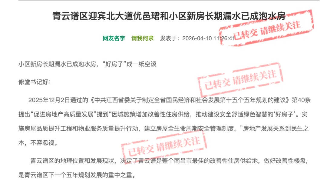 如今交房不满半年,小区地库及楼道多处漏水,下雨天更是成为泡水房,小区业主多次集体投诉,住建局声称已经核实并联系整改到位,但事实是依然漏水不停。事实上,这不是优邑珺和业主第一次投诉,小区交付前也曾被投诉。该业主原贴原文: