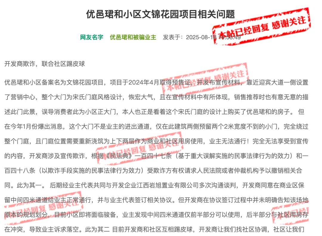 优邑珺和小区备案名为文锦花园项目,项目于2024年4月取得预售证在并发布宣传材料,靠近迎宾大道一侧设置了营销中心,整个大门为宋氏门庭风格设计,恢宏大气,且在宣传材料中有所体现,销售推荐时也有意无意的描述此门此景,误导消费者此为小区正大门,本人也正是看着这个宋氏门庭的设计上购买了优邑珺和的房子。