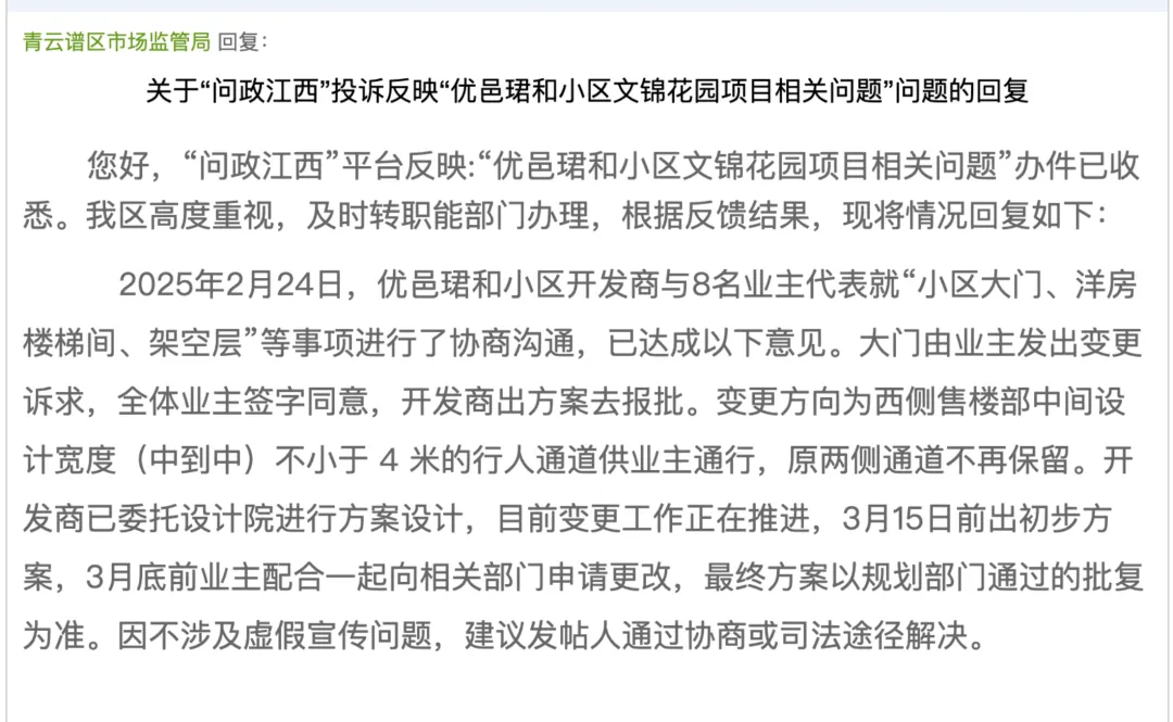 2025年2月24日,优邑珺和小区开发商与8名业主代表就“小区大门、洋房楼梯间、架空层”等事项进行了协商沟通,已达成以下意见。大门由业主发出变更诉求,全体业主签字同意,开发商出方案去报批。变更方向为西侧售楼部中间设计宽度(中到中)不小于 4 米的行人通道供业主通行,原两侧通道不再保留。开发商已委托设计院进行方案设计,目前变更工作正在推进,3月15日前出初步方案,3月底前业主配合一起向相关部门申请更改,最终方案以规划部门通过的批复为准。因不涉及虚假宣传问题,建议发帖人通过协商或司法途径解决。