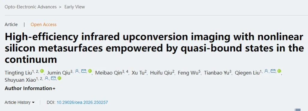 近日,南昌大学信息工程学院成像与视觉表示研究团队在非线性光学成像领域取得重要研究进展。团队提出基于准连续域束缚态(Quasi-Bound States in the Continuum, Quasi-BICs)的硅基非线性超表面设计,实现了高效的红外上转换成像。相关成果以“High-efficiency infrared upconversion imaging with nonlinear silicon metasurfaces empowered by quasi-bound states in the continuum”为题,在线发表于光学领域国际顶级期刊Opto-Electronic Advances(影响因子:22.4)。