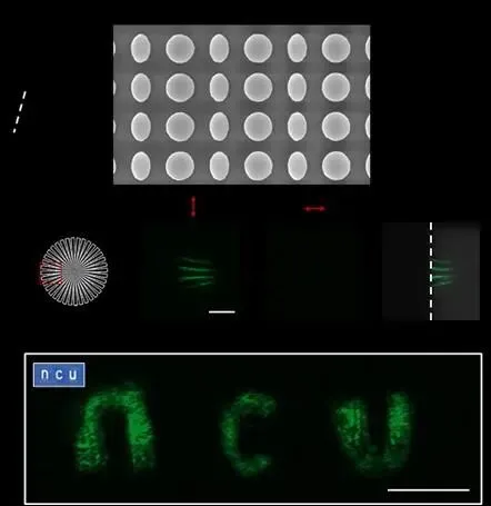 图1. Quasi-BICs超表面实现的红外上转换成像。针对这一难题,研究团队设计了由硅纳米圆盘与椭圆盘构成的二聚体单元(图1(a))。不同于传统的同时在多个方向引入扰动的设计,该工作通过精确控制椭圆盘在单方向(x轴)上的面内对称性破缺程度,将原本不与连续域辐射模耦合的BICs转化为具有有限寿命的Quasi-BICs共振。这种单向扰动策略能够更有效地抑制辐射损耗,实验测得该超表面在近红外波段表现出高Q因子的共振特性,其实验Q因子最高可达4000。为验证该技术在红外成像领域的应用潜力,研究团队搭建了非线性上转换成像系统,对多种目标图案进行了演示(图1(b)和1(c))。实验采用西门子星(Siemens star)分辨率靶标作为测试对象,结果显示,上转换后的可见光图像能够清晰地分辨靶标中心的细微条纹,其空间分辨率约为6 μm。此外,该平台对复杂字符图案(如“NCU”)也展现了良好的上转换保真度,图像轮廓清晰且具有较高的信噪比。