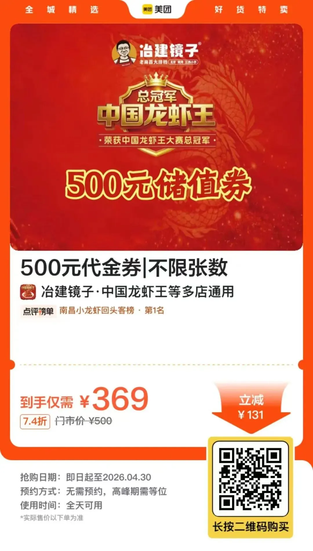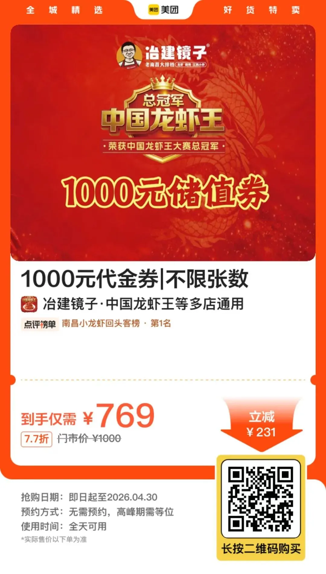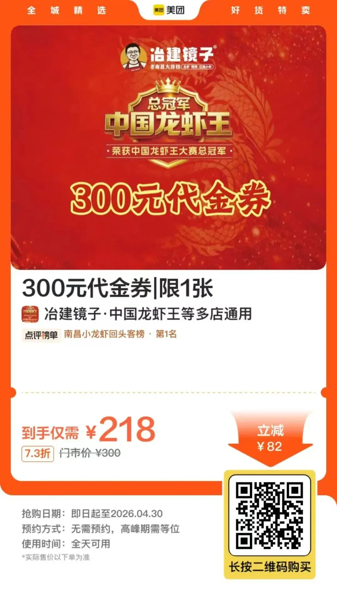 南昌夜宵必选「冶建镜子」补库存了,218抵300!369抵500!769抵1000!啤酒、小龙虾、撸串…约起来!