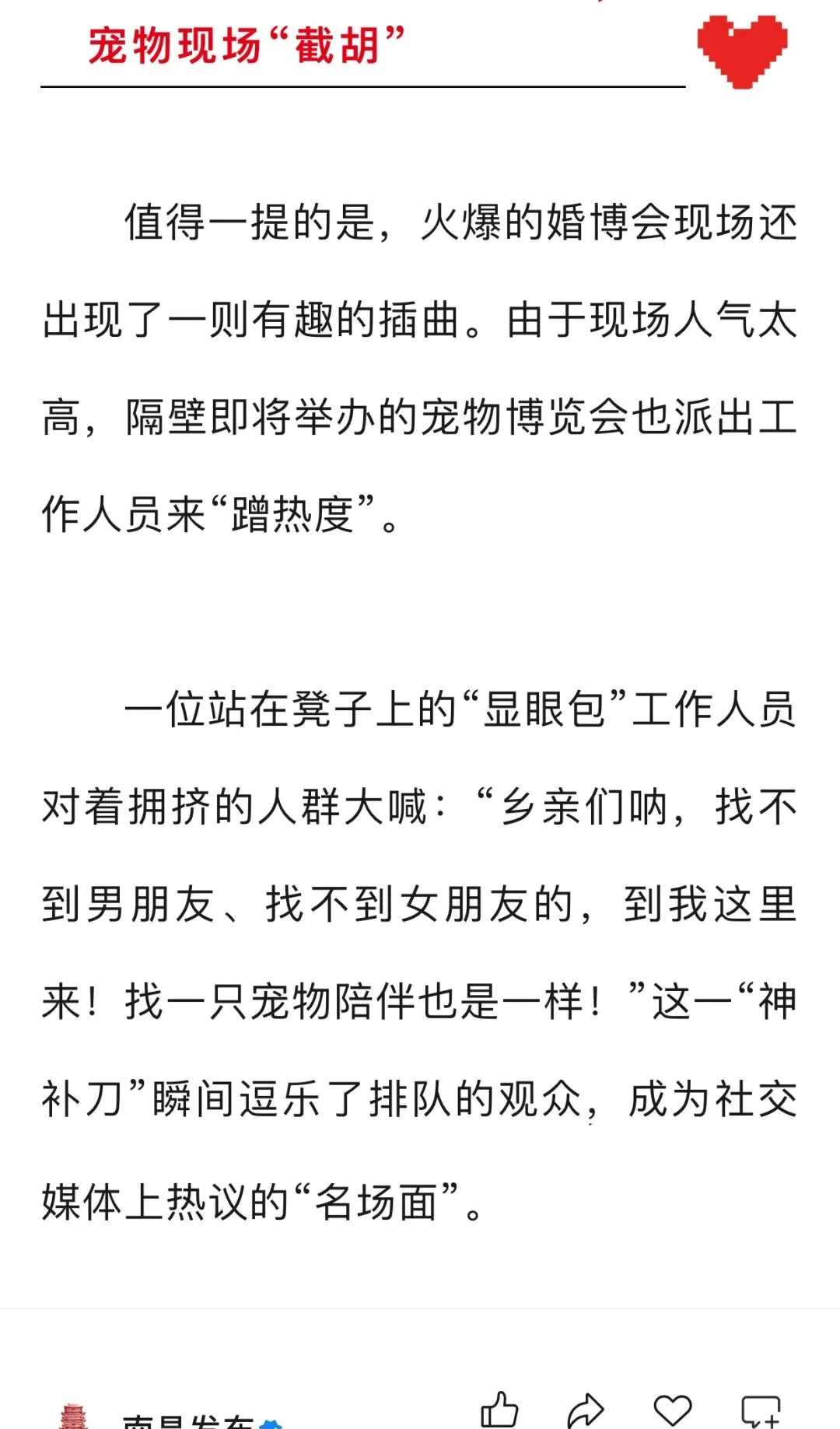 一位站在凳子上的“显眼包”工作人员对着拥挤的人群大喊:“乡亲们呐,找不到男朋友、找不到女朋友的,到我这里来!找一只宠物陪伴也是一样!”这一“神补刀”瞬间逗乐了排队的观众,成为社交媒体上热议的“名场面”。