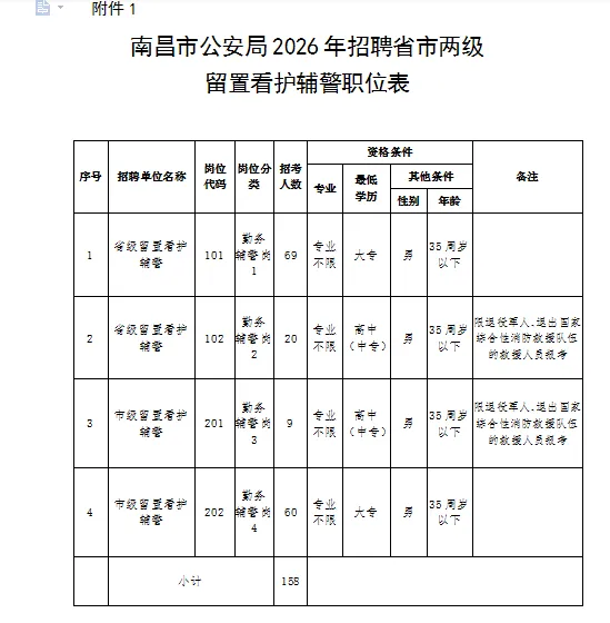 南昌市公安局2026年招聘省市两级留置看护辅警公告节选