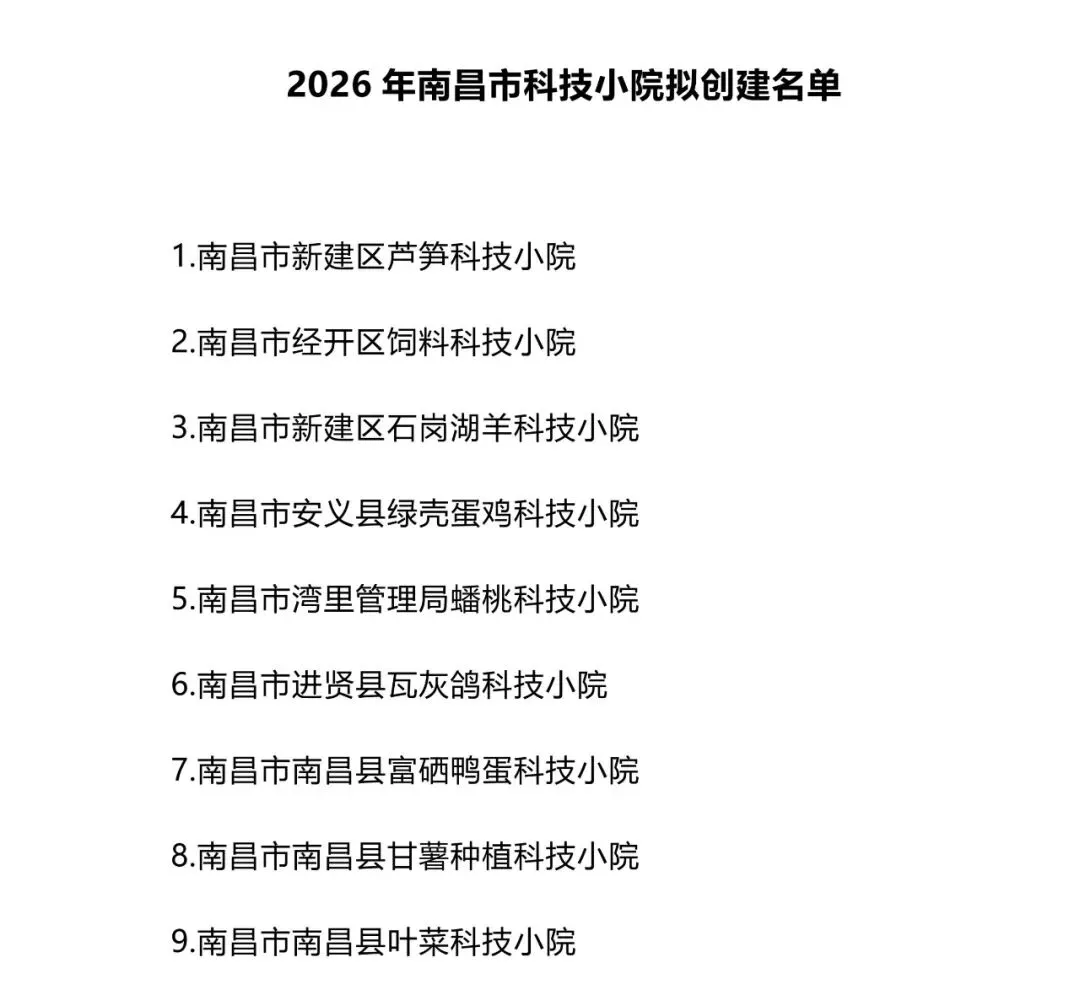 根据市科协《关于推荐申报2026年南昌市科技小院的通知》的有关要求,经自愿申报、资格审核、专家评审、实地考察等程序,拟创建南昌市新建区芦笋科技小院等9家科技小院,现予以公示。