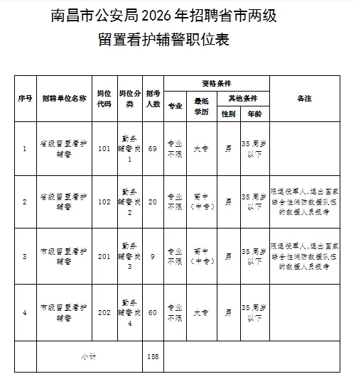 (一)招聘人数:158人,其中省级留置看护89人、市级留置看护69人;