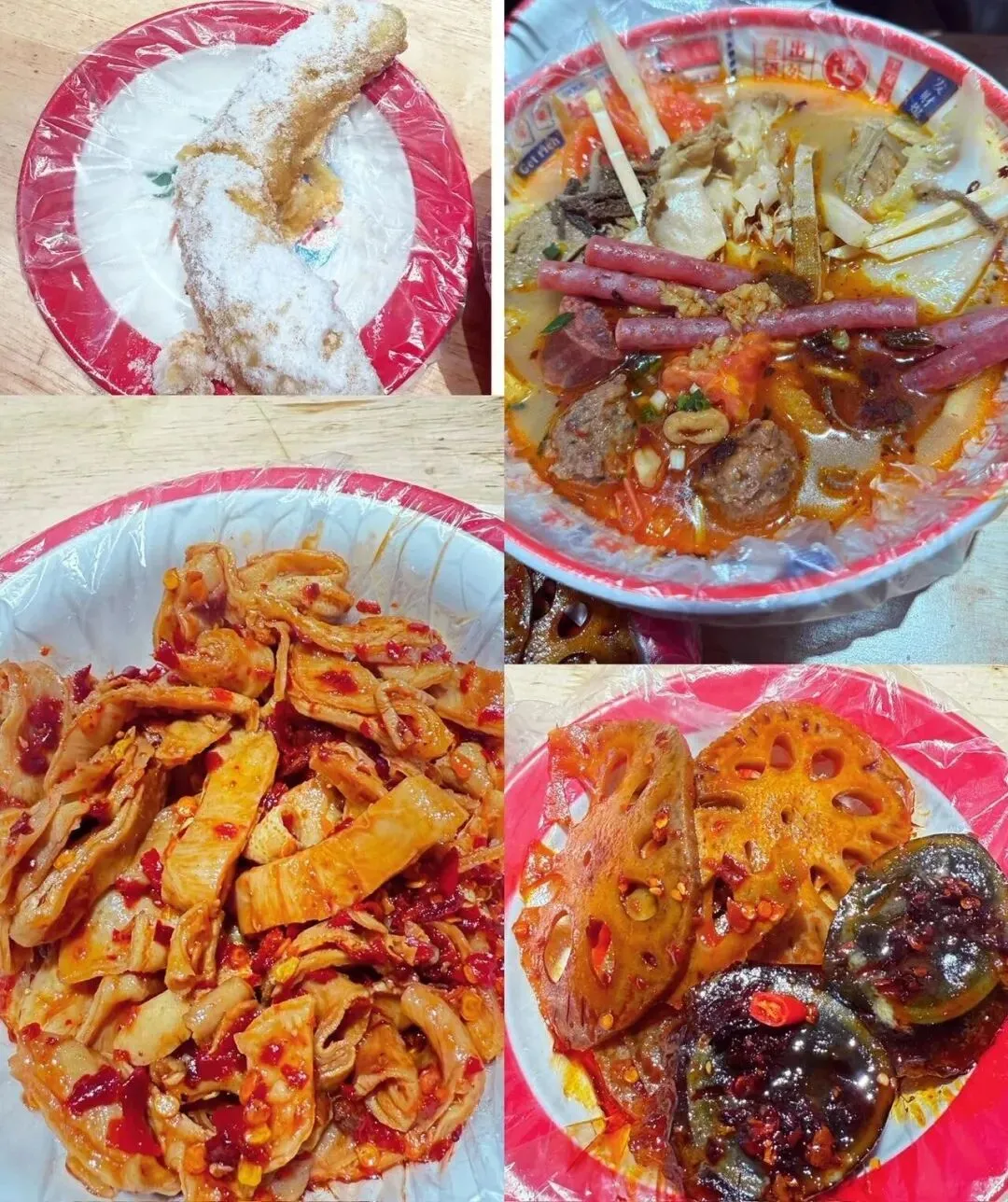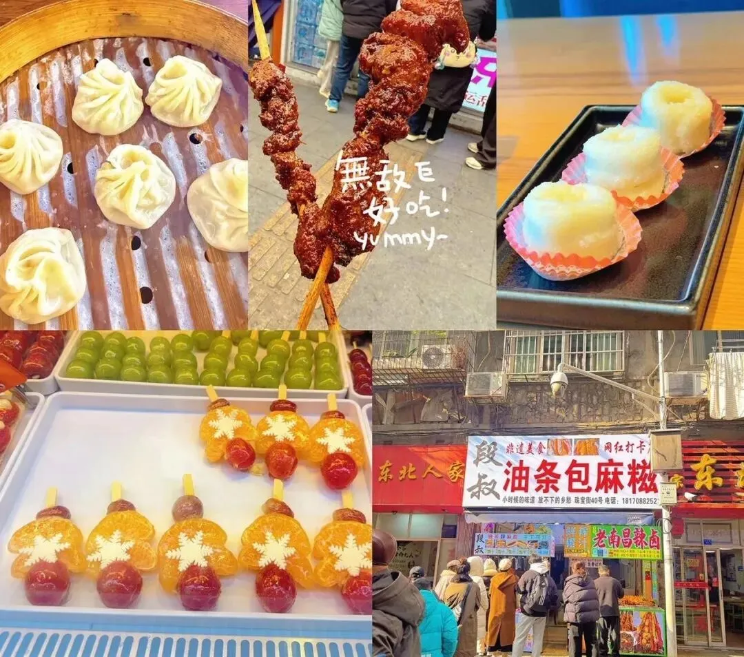 其他还有一些小吃,网红肉串、冰糖葫芦、油条包麻薯、沙茶里脊、白糖糕。