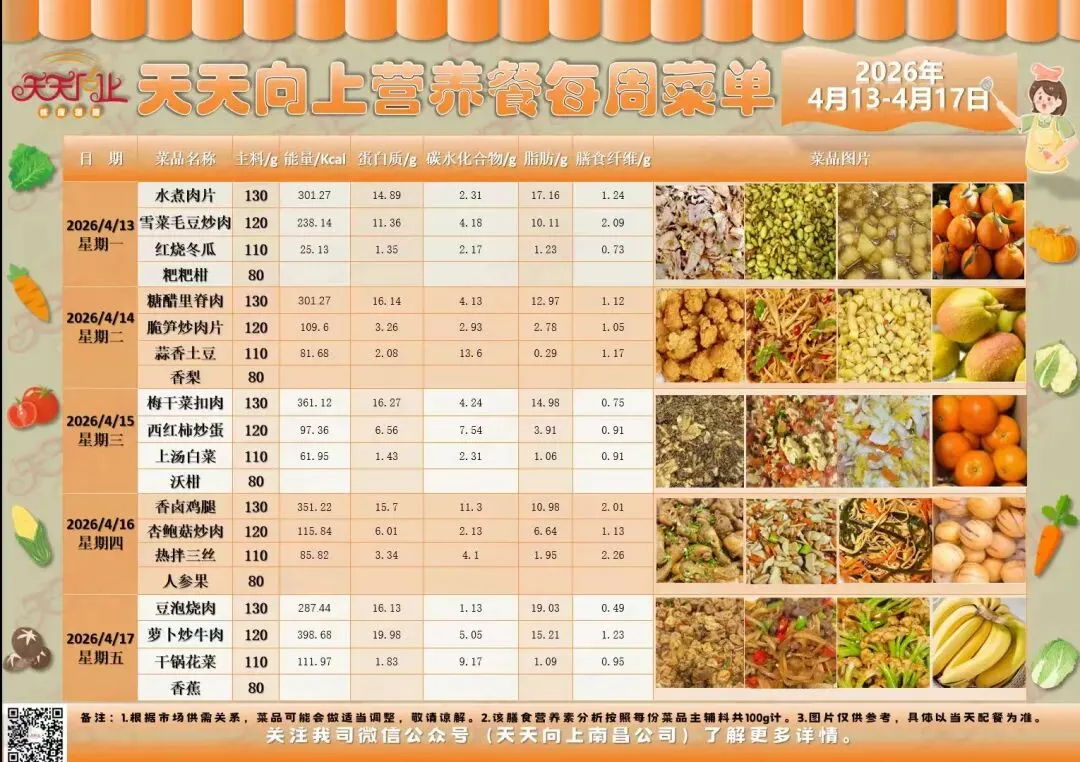 根据《南昌市中小学(幼儿园)配送餐管理办法》和相关精神,现将本校2026年4月13日—2026年4月17日菜谱公示如下: