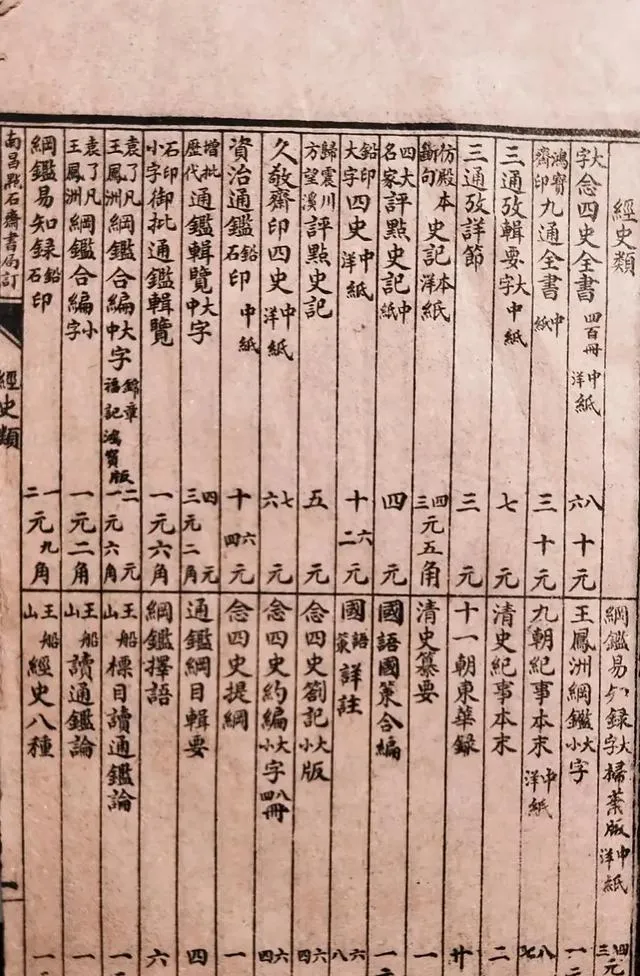 这张古书局的价目表,印刷工整,左一排右一排全是书名,大字四史、资治通鉴、高阳新记,最贵的得花八十块银元。那时候买书是件正事,家里如果能收一本厚本的史记,都算有文化底气,爹辈说,“八十银元不是小钱,那年你姑父攒一年才买下来,书架上放着不准碰”,现在想想,电子书随手一翻,花头多得没人看完。