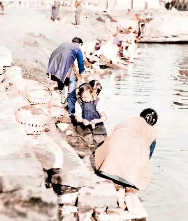 城里人家,没有洗衣机,照片里的洗衣埠台阶一格一格磨得溜光,大人孩子都卷起裤脚靠水坐,小手搓搓衣裳,笑着吵着,也挤挤闹闹。男埠女埠分得清,每家各找台阶,哪天掉进水里,准有大人拉一把。现在的自来水一开就响,老场景还能回味在记忆里。