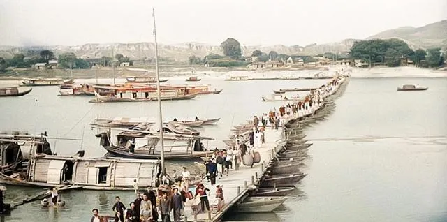 这个像长龙一样的桥叫做浮桥,几十条小船头尾相连,两岸用木板一搭,成了一条临时的路,自古南昌水多,靠水吃水,逢年过节桥上全是人,走在浮桥那咯吱咯吱的声音,心里还真有点慌,妈妈说那时过河靠这玩意,下雨天滑得走路都得把鞋子甩了,赤脚踩着更安稳,现在桥修得结结实实,这样临时凑出来的景,再年轻人怕是没见过。