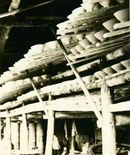 这个屋檐下的木架全塞满了瓷碗瓷盘,密密麻麻四五层叠着,老工人弯腰搬来搬去,小心翼翼,哪敢掉一个,听得见瓷器轻轻碰在一起的声音。小孩站在门口瞅着好奇,手都不敢乱摸,这一排排白生生的碗,就是一家生计,村里谁办酒席,还得来这边先赊一堆回去用。
